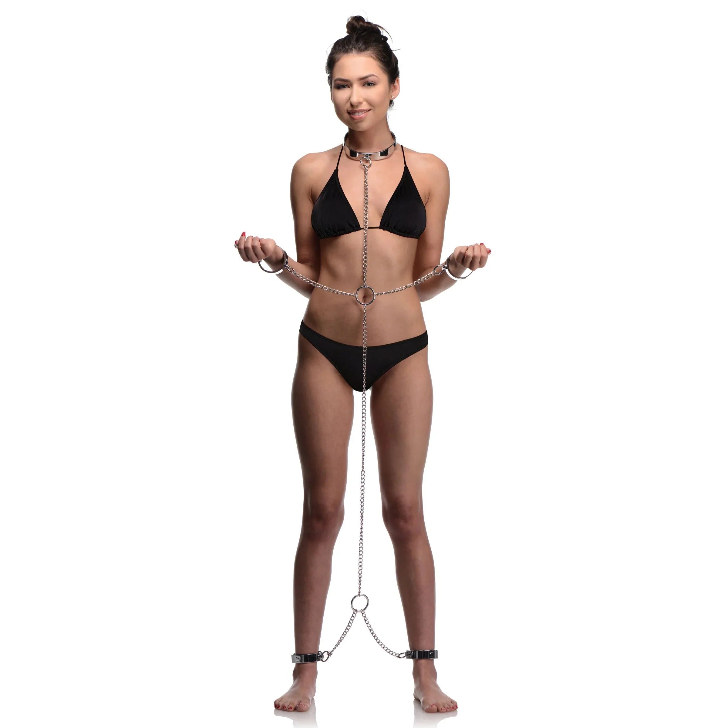 Large: Collar: 17.5" in circumference. Wrist cuffs: 7.25" in circumference, 0.75" in width. Ankle cuffs: 8.5" in circumference, 0.75" in width. Length of collar chain: 12.5". Length of each wrist chain: 6.75". Length of chain between two rings: 31.25". Length of each ankle chain: 6.75".