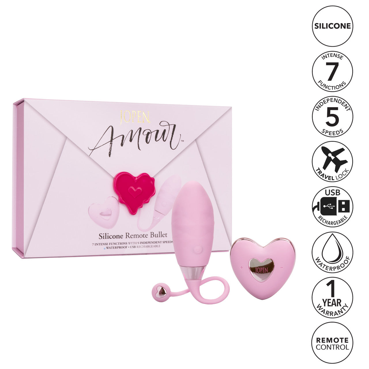 The sexy-pink silicone, fully remote Amour vibrating bullet by Jopen has brought together the best features of many other similar products on the market, combining them with a unique design and a contemporary finish. When you put them together to make a truly universal product... Discrete and portable? Check. Fully remote with enough charge time? Check. Share-ability? Check. Fully Submersible and easy to clean? Check. With seven settings and five speeds to choose from on each setting, this is definitely designed for the maximum variety of sensations and experiences.