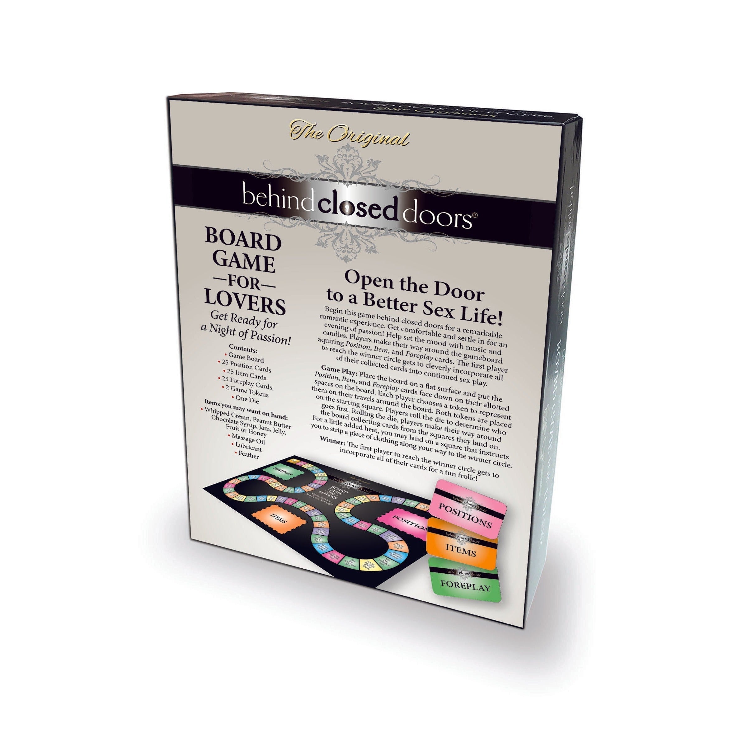 The Behind Closed Doors Board Game is easy to play! As you travel the game board, collect Position, Item, and Foreplay cards. The first player to reach the Winner Circle gets to incorporate all of their acquired cards into the sex play that follows!