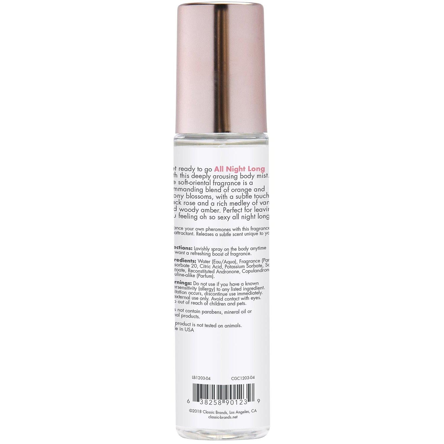 CG takes their delightfully arousing signature "All Night Long" fragrance and incorporates it into body mist form that turns the fragrance into a mist of arousal. CG's "All Night Long" signature fragrance is a soft-oriental aroma with subtle floral and fruity elements. The soft aroma is a combination of orange and peony blossom with a dash of black rose and an accord of vanilla with wood amber. CG Pheromone Fragrance Body Mists are paraben-free, do not contain mineral oil or animal products, and are made in the USA.