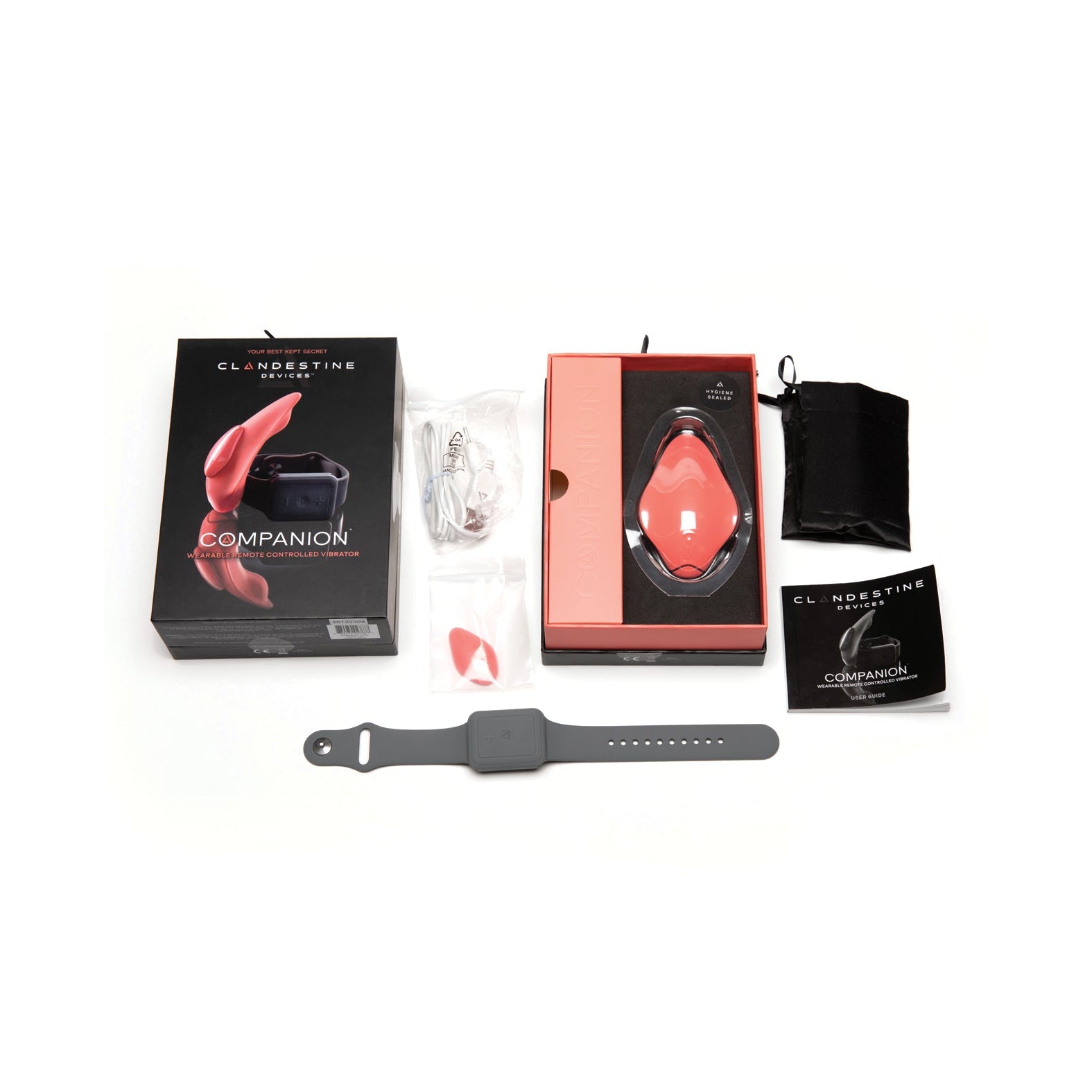 Velvety wings and stay-put magnet keep the rechargeable Companion panty vibe in place allowing the user to take their fantasies anywhere, even underwater. With its slim, contoured fit, companion molds to all body shapes and sizes with comfort. Pleasure and control become wearable with the covert remote featuring a detachable smart watch band.