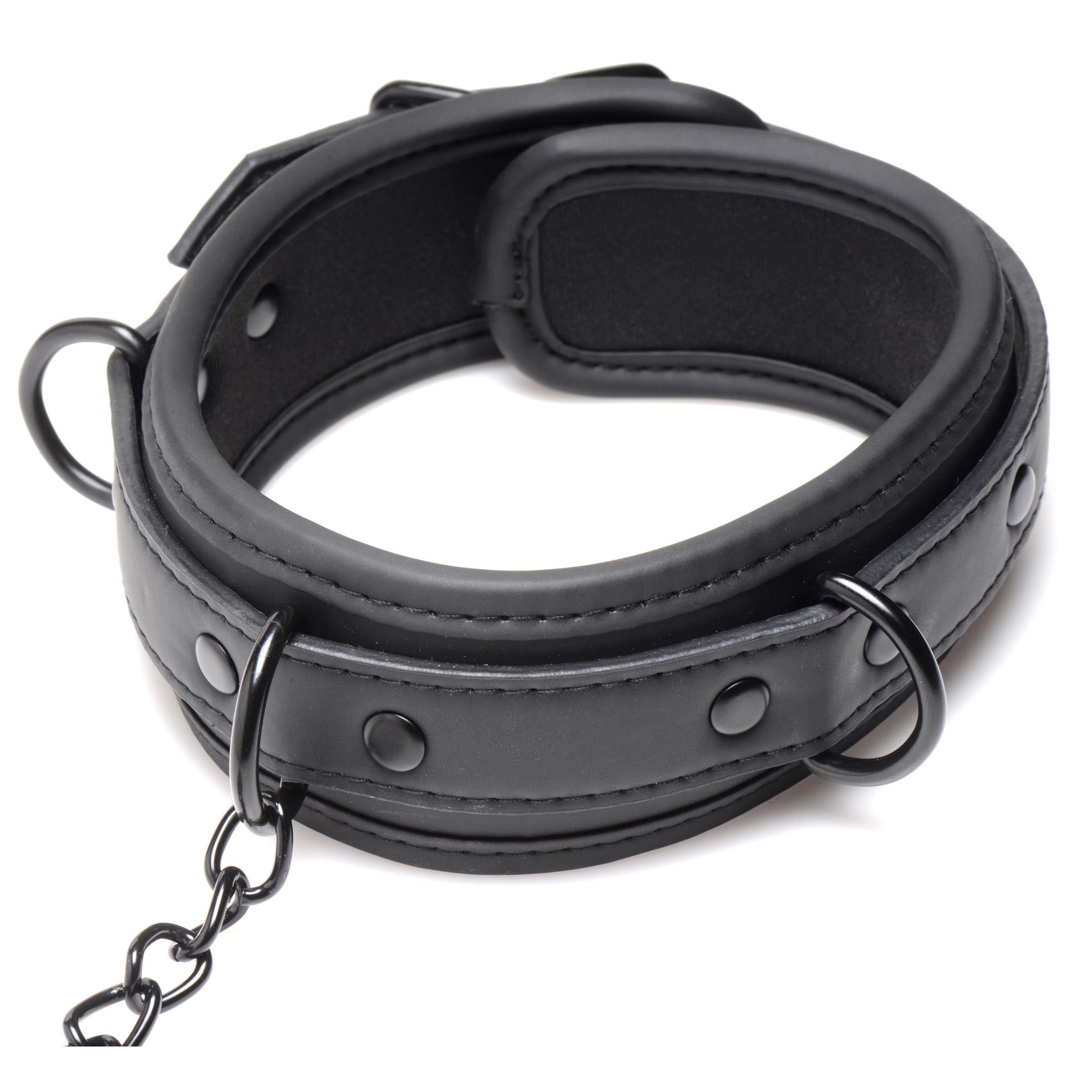 Have your lover kneel in front of you as you place their collar around their neck. The buckles clasp and you make sure the collar fits snug and comfortably so they can feel the gentle, padded and smooth texture of the neoprene. You take the chain at the center of their throat and pull them gently towards you, making them lift their chest. Taking their nipple in your free hand, you take the clamp and place it slowly behind the nipple, on the areola, and adjust the pressure using the small screw. Doing the same on the other nipple, you hear your lovers breath catch in their throat and gasp as they begin to mingle pain and pleasure, experiencing it all at your hands.