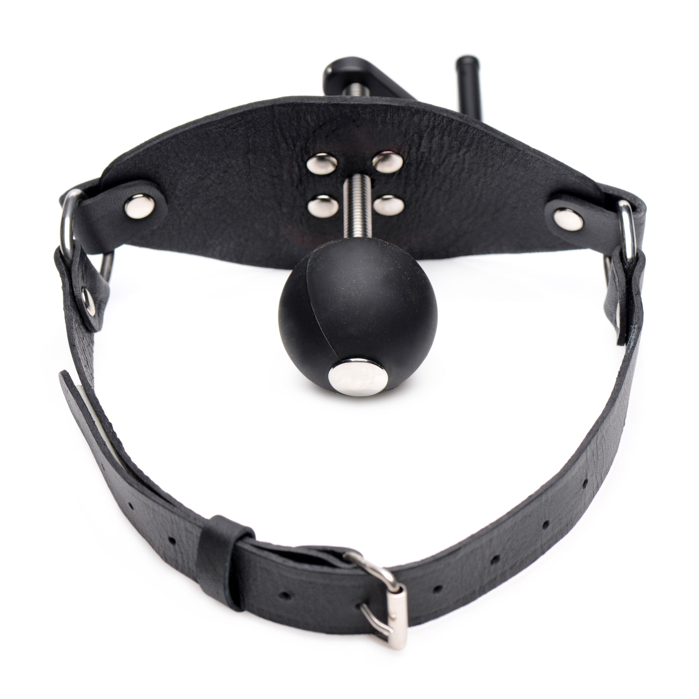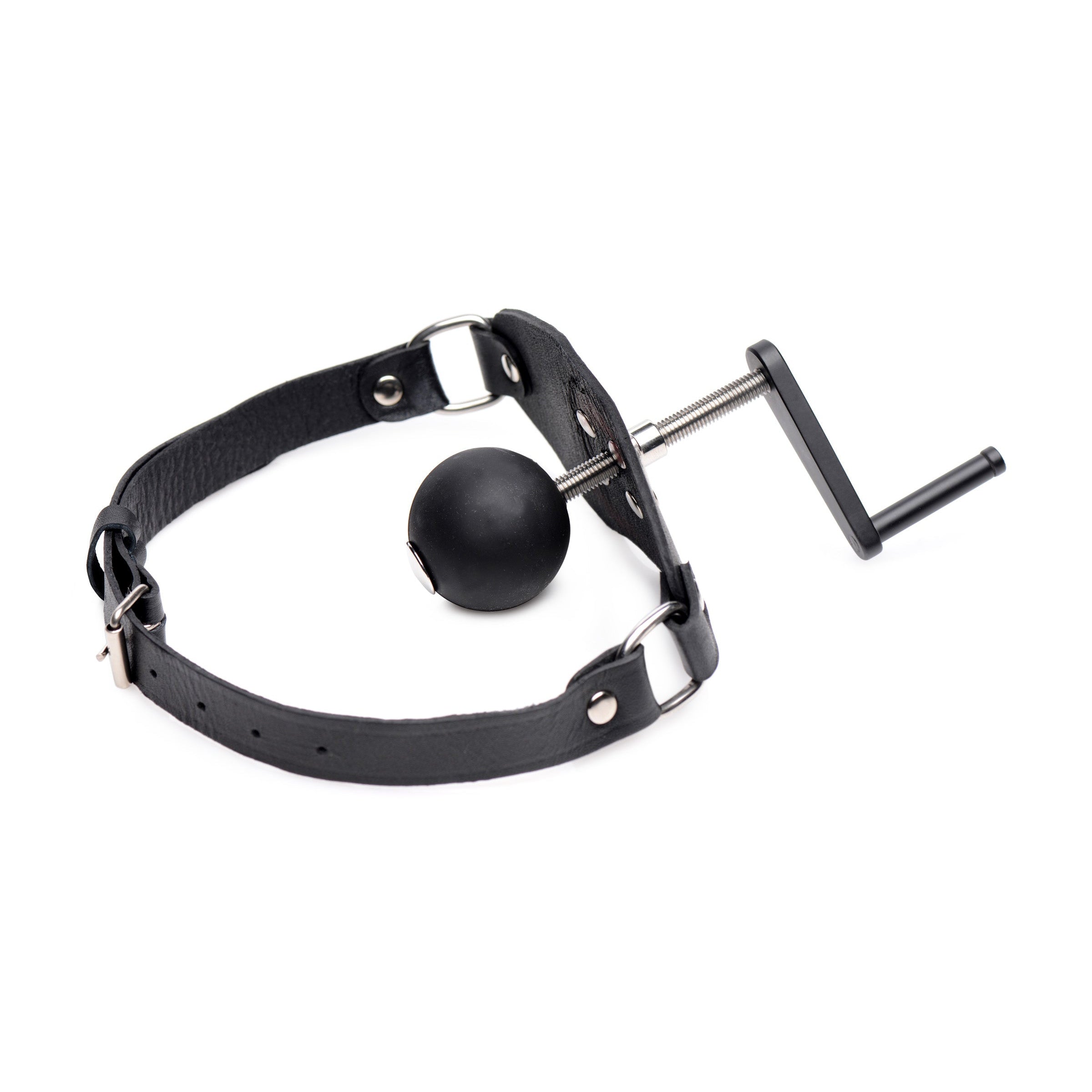 Open wide! Your partner will not have a choice when you stuff this unique ball gag into their mouth! Fasten the strap tightly at the nape of their neck, pushing the silicone ball past their bratty lips and teeth. The thick panel of fine leather will muffle any moans or whines that might still escape. Time to release the wickedness within! The cruel crank allows you to push the silicone ball deeper and deeper into their mouth, prying their desperate mouth open more and more. Take your BDSM play into a new territory of tantalizing torment...