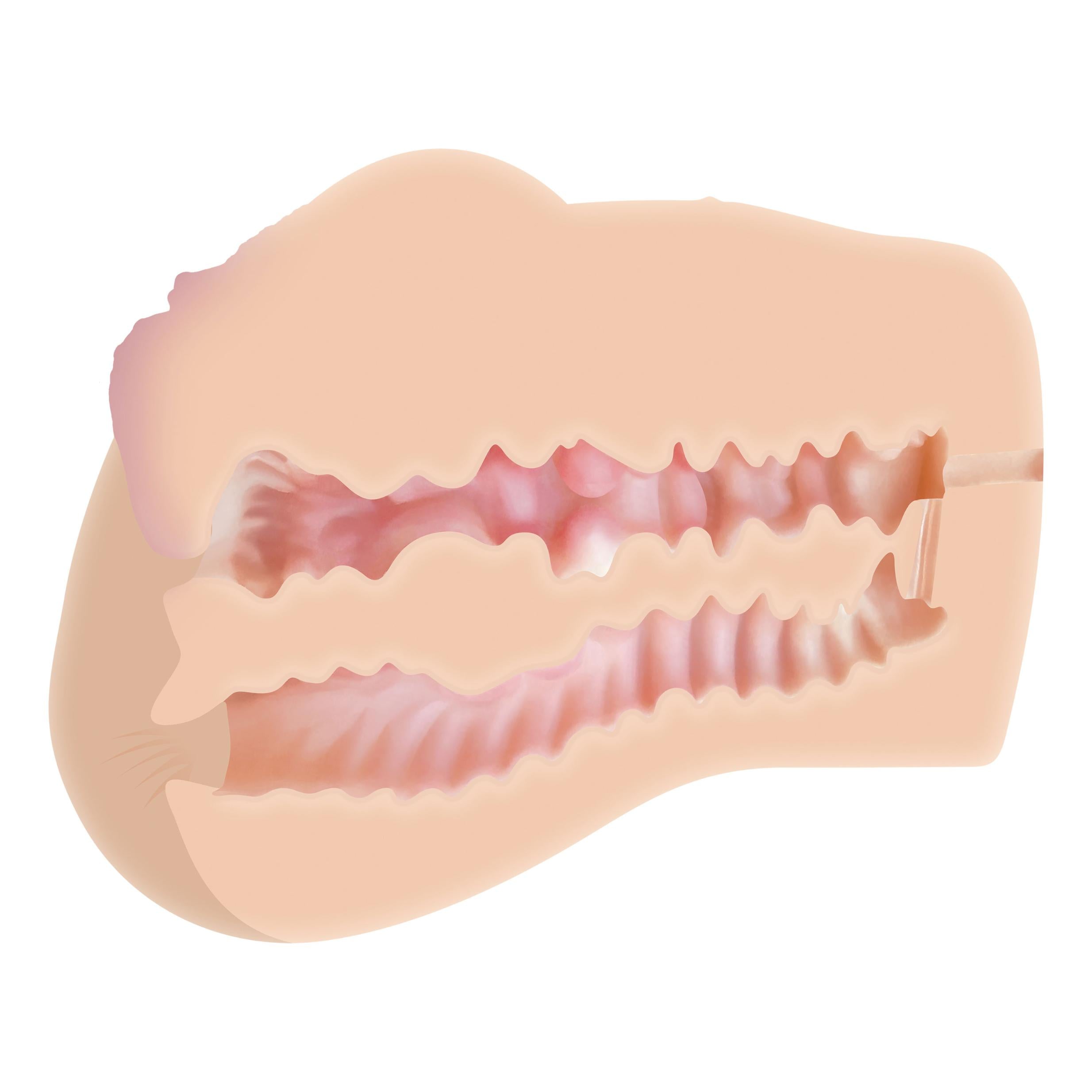Fulfill your double fantasy with this two-channel stroker that lets you slip through the front door and bang the back door as hard as you want! Crafted with super-stretchy and pliable TPE rubber that moves with your body as you thrust, use the hips to hold on, and dive into that pink sweet spot primed with complimentary ZT lube. Feel the life-like tight fits of vaginal and booty canals all around you as you watch the notorious Dani Daniels for some superhot hardcore inspiration!