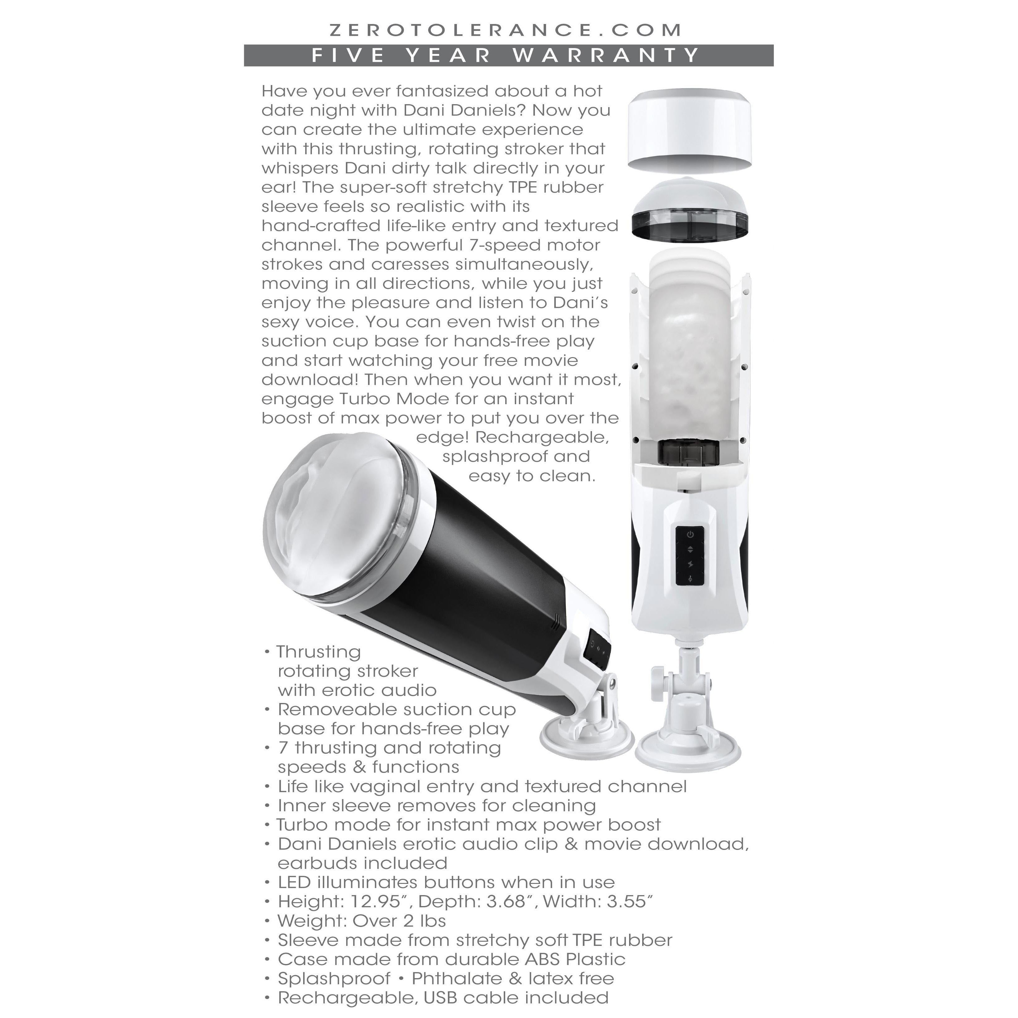 Have you ever fantasized about a hot date night with Dani Daniels? Now you can create the ultimate experience with this thrusting, rotating stroker that whispers Dani dirty talk directly in your ear! The super-soft stretchy TPE rubber sleeve feels so realistic with its hand-crafted life-like entry and textured channel. The powerful 7-speed motor strokes and caresses simultaneously, moving in all directions, while you just enjoy the pleasure and listen to Dani's sexy voice. You can even twist on the suction cup base for hands-free play and start watching your free movie download! Then when you want it most, engage Turbo Mode for an instant boost of max power to put you over the edge! Rechargeable, splashproof and easy to clean.