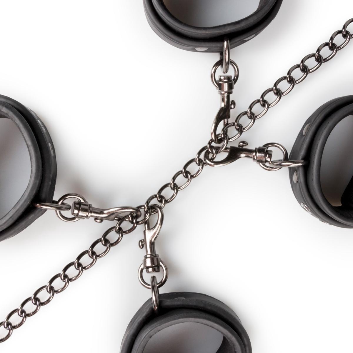 Prepare for a world of delightful, devious fun! This restraint set is internally lined with foam, making it incredibly comfortable to wear for long periods of time. So, no matter how punishing your play, this restraint will keep them comfortably and securely in place for the duration. Boasting a beautiful BDSM look and feel, the cuffs and collar are all connected with a heavy-duty chain, while the ergonomic snap clip fasteners mean that they can each be worn independently of one another if desired. Featuring additional D-rings, you can even attach the collar to other leads and restraints for completely customized gratification. Pair this versatile restraint up with your favorite ankle restraints, nipple clamps, a bondage gag or other BDSM accessories to set the ultimate scene!
