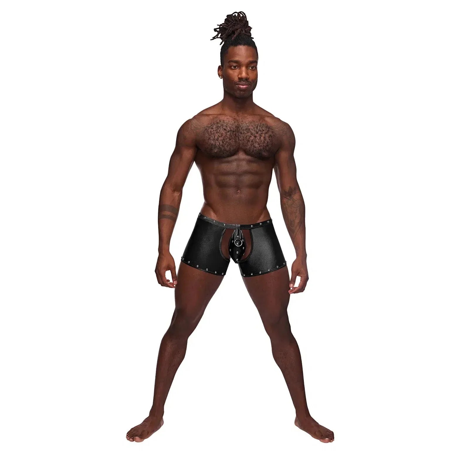 From the Fetish collection by Male Power, this style includes: Chaps with a detachable velcro thong, decorative studs, and a cire waistband.