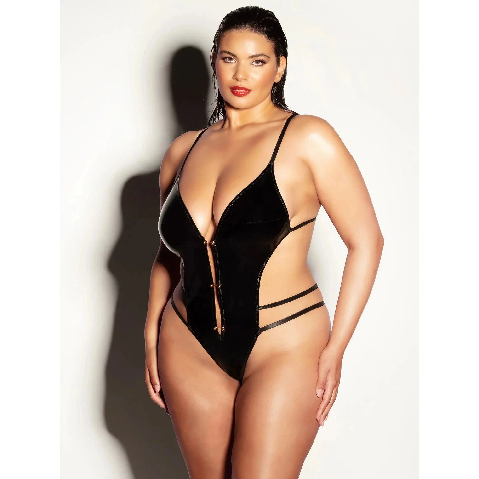 Unleash your inner temptress with the Fetish Curvy Whipped Teddy. Crafted from a mix of vinyl and barbell trim, this alluring teddy features a captivating cut out that adds a touch of seductive charm. The crotchless G-string back design exudes confidence and sexiness, while the standard adjustable shoulder straps provide the perfect fit. Whether you're looking to set the mood or surprise someone special, this Fetish Curvy Whipped Teddy is sure to make a lasting impression.