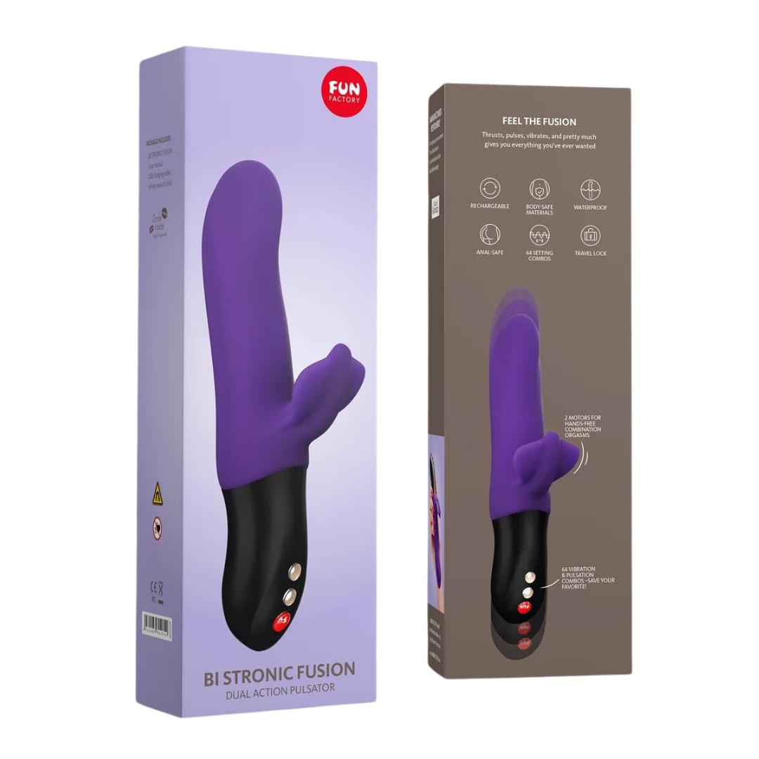 The Bi Stronic Fusion has a design based on traditional rabbit vibes, but it employs advanced technology that makes it appealing and exciting to use. The toy has a thrusting action powered by the patented Fun Factory thrusting technology. It has a vibrating motor in the clitoral stimulator. The functions are controlled separately or together, and you can use it as a handheld or handsfree device. It is made from body-safe silicone, is waterproof, and can easily be cleaned. The charging is via the magnetic USB charger, and the Bi Stronic Fusion comes with a 2-Year Fun Factory Warranty.