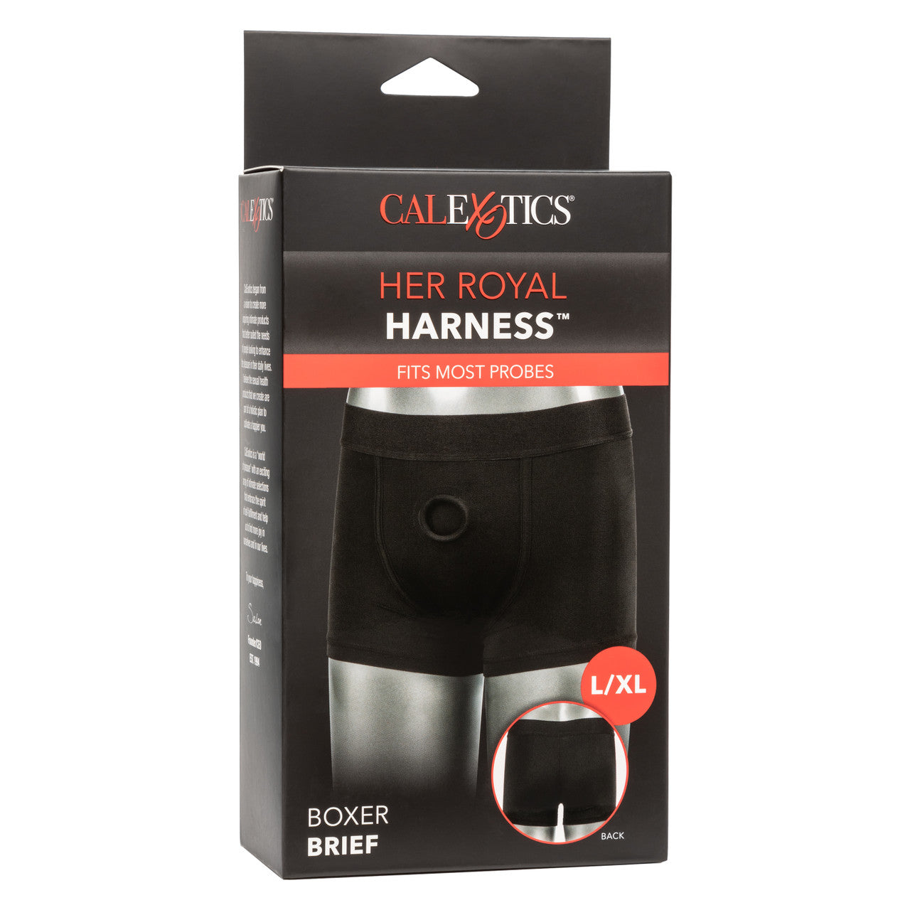 The Her Royal Harness™ Boxer Brief is an ultra-comfortable, easy wear harness designed with powerful performance and comfort in mind. This classic harness has a supportive extra-wide waistband, soft stretchy material and reinforced O ring for the ultimate support. Enjoy easy access to your favorite probe with the accommodating double panel interior design. The durable, reinforced O-ring stretches to accommodate your favorite probe, packer, vibrator or dildo. Beginners and expert users alike will love frustration-free pleasure with this easy-to-wear harness. Simply secure your favorite probe, slip into the extra stretchy boxer brief style harness and dive deep into passionate penetration or enjoy comfortable all-day wear. Enjoy easy clean up by machine washing and hanging to dry.