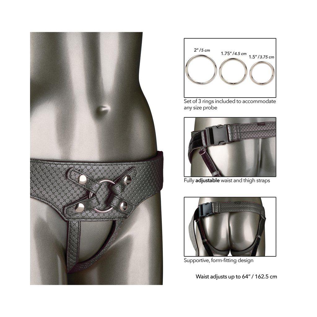 - Plush fabric, buckle-waist enclosure and vegan leather harness rig with O-rings that fits dildos requiring 1.5, 1.75 and 2 inch O-rings