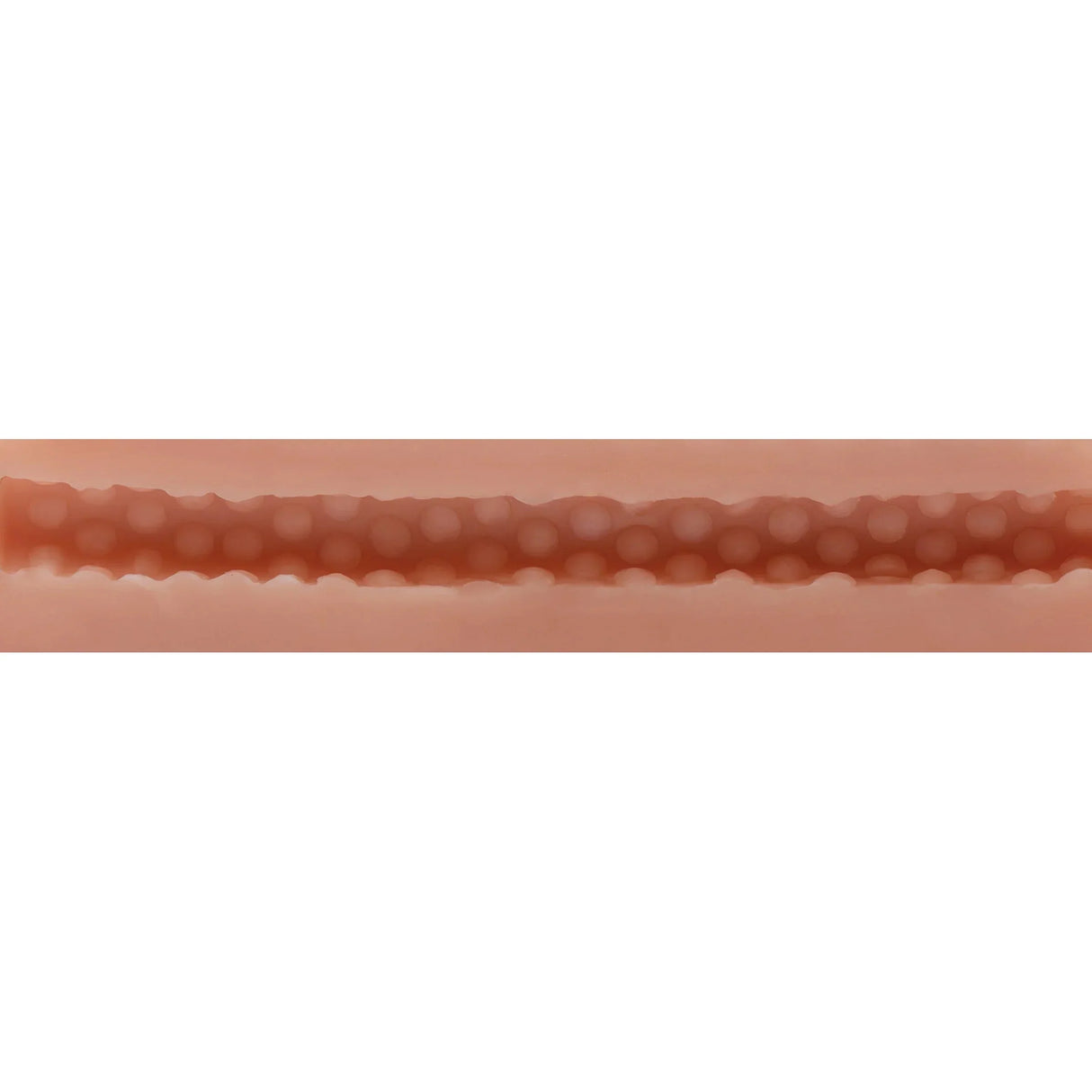 The masturbator is made from body-safe TPR rubber and is compatible with both water and silicone-based lubes. The openings are stretchy and fit all penis sizes. The toy is designed with one flat side, making it ideal for propping the masturbator on the bed, on pillows, or on any convenient surface. There are two internal channels, one for the pussy, and the other for the ass.