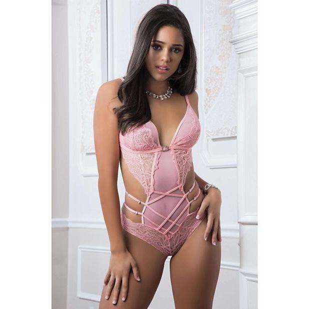 A provocative strappy teddy comes with kisses of lace and straps over sheer mesh and matching playful mask.