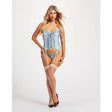 Lace and mesh bustier with lace up center front detail, adjustable garter straps and matching thong panty, all with gold hardware.