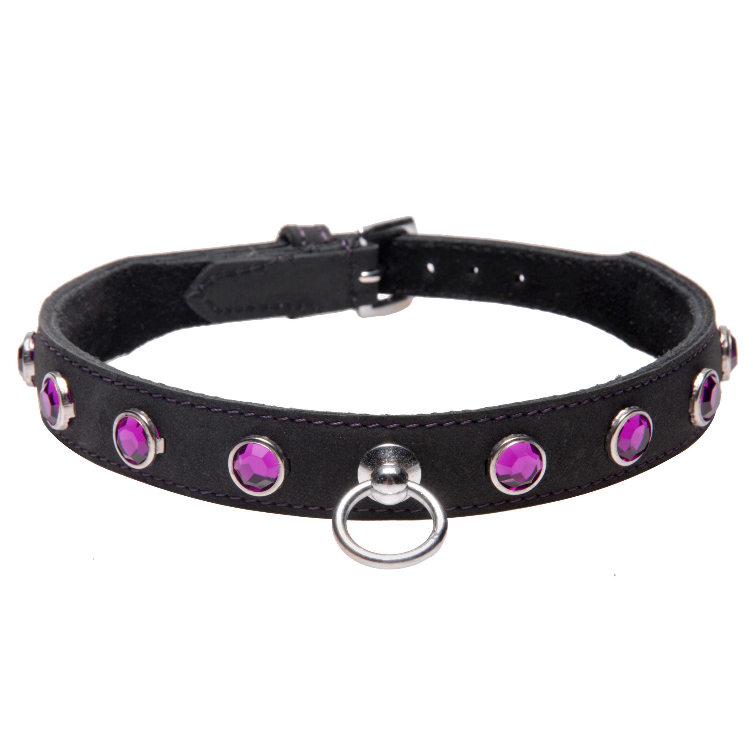 Made of calf nubuck leather, this enticing collar will encircle their throat with style and luxury. The gems are rimmed with shining metal, and the collar is edged with matching stitching. The buckle in the back allows you to adjust it to fit, while the D-ring at the front can serve as decoration, or as a point of attachment for any number of exciting accessories. Slim and comfortable, this seductive collar is sure to add a touch of glamour to your next scene.