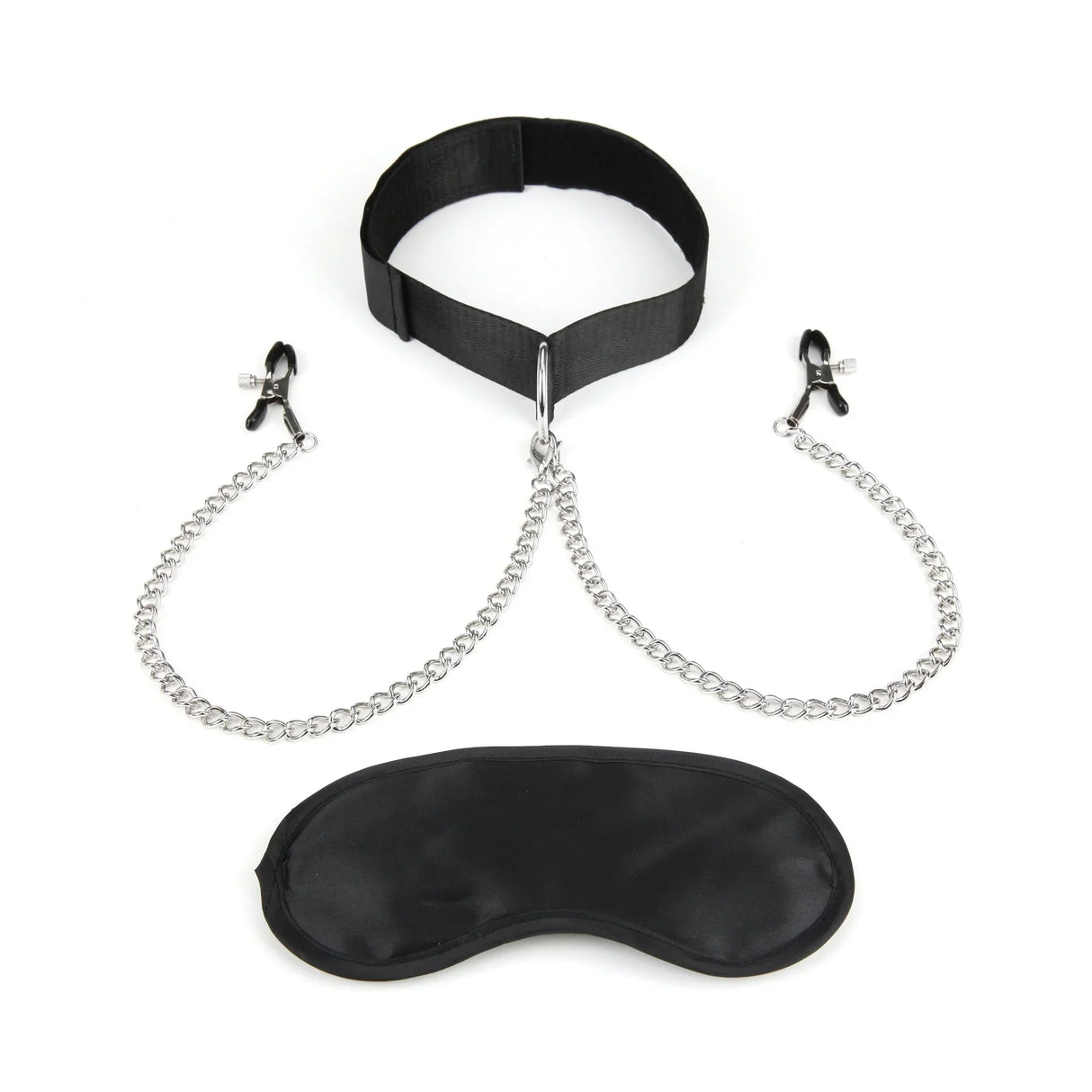 Experience the exhilaration of nipple play with this sexy collar with nipple clamps, which are adjustable to offer a tailored sensation. Additionally, the fully adjustable collar will fit most users to ensure a comfortable fit while you focus on the stimulation of your nipples as they're erotically pinched to your liking. A D-ring and clips secure the clamps to the collar. This set also comes with a blindfold to further enhance the experience, and for some deliciously good sensory deprivation fun.