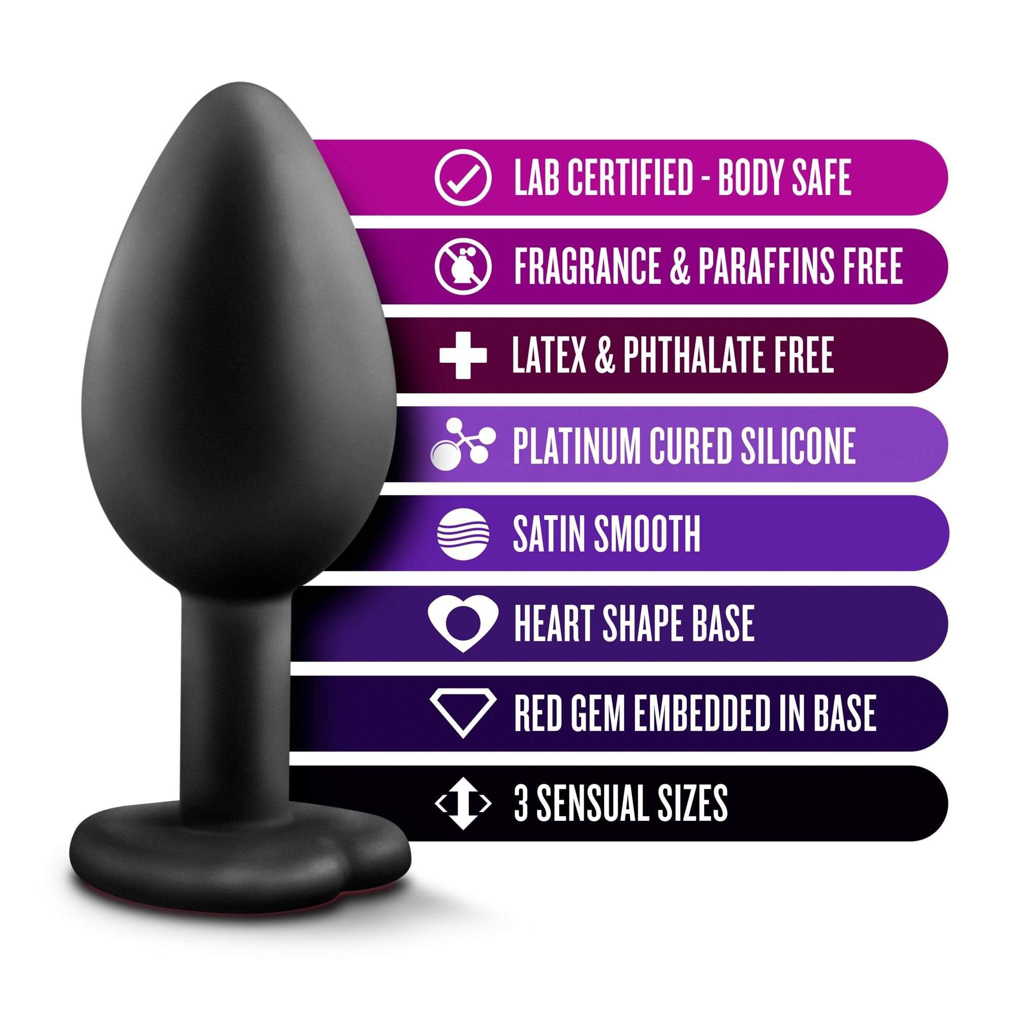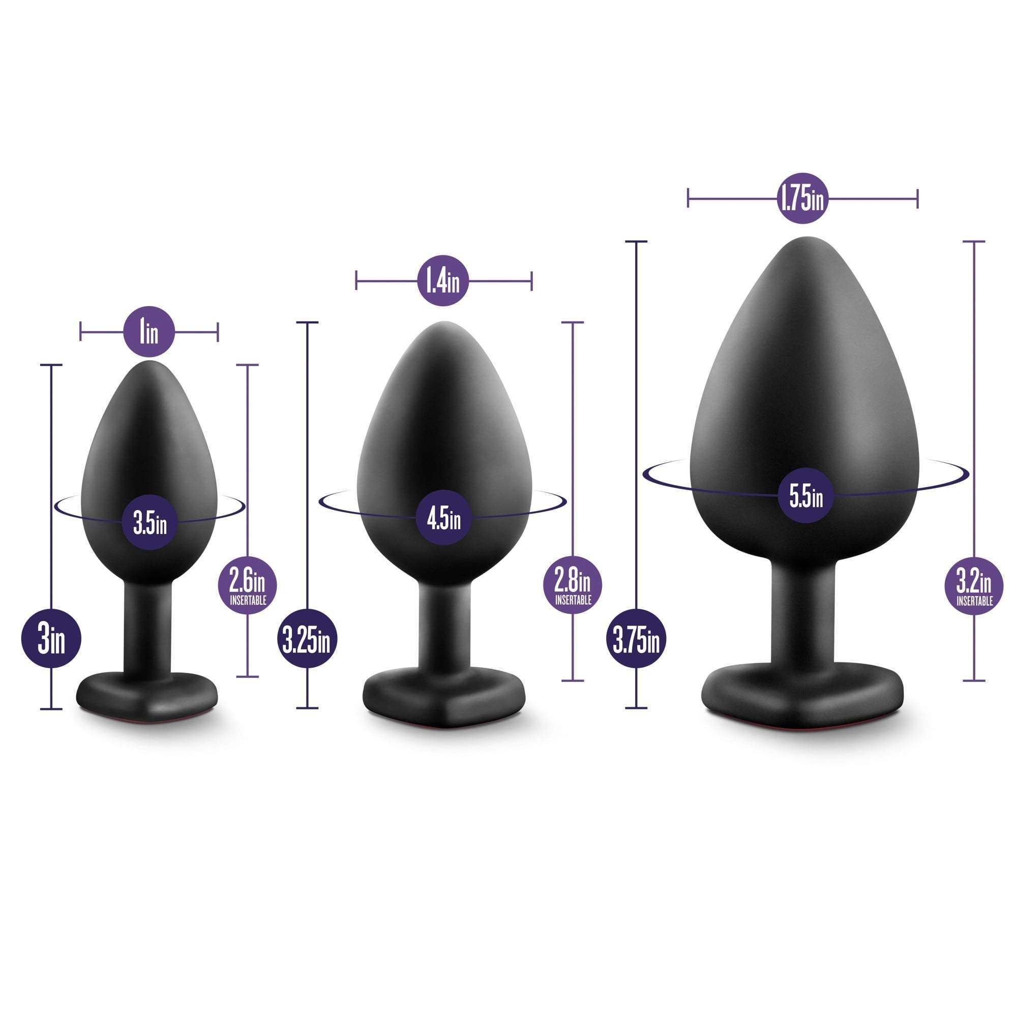 - Graduating sizes, set of 3 pure silicone butt plugs with heart-shaped acrylic gems set in base