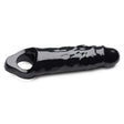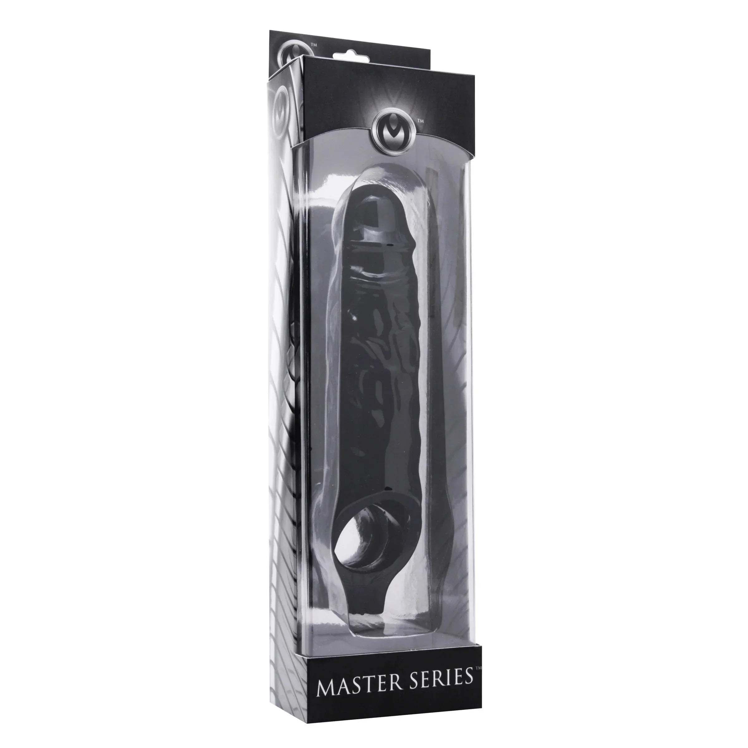 The dark knight can rise every night with this premium, plus-sized, hollow black penis sleeve. It features a super-stretch scrotal ring for added pleasure, stamina and also acts as a powerful anchoring base for the sleek, heavily veined, 8.5 inch cock. Can even accommodate a penis at rest, and has a generous, flexing interior cavity to accommodate most average-sized guys. Give your partner extra girth and inches, while still retaining your personal style of lovemaking and skin on skin intimacy!