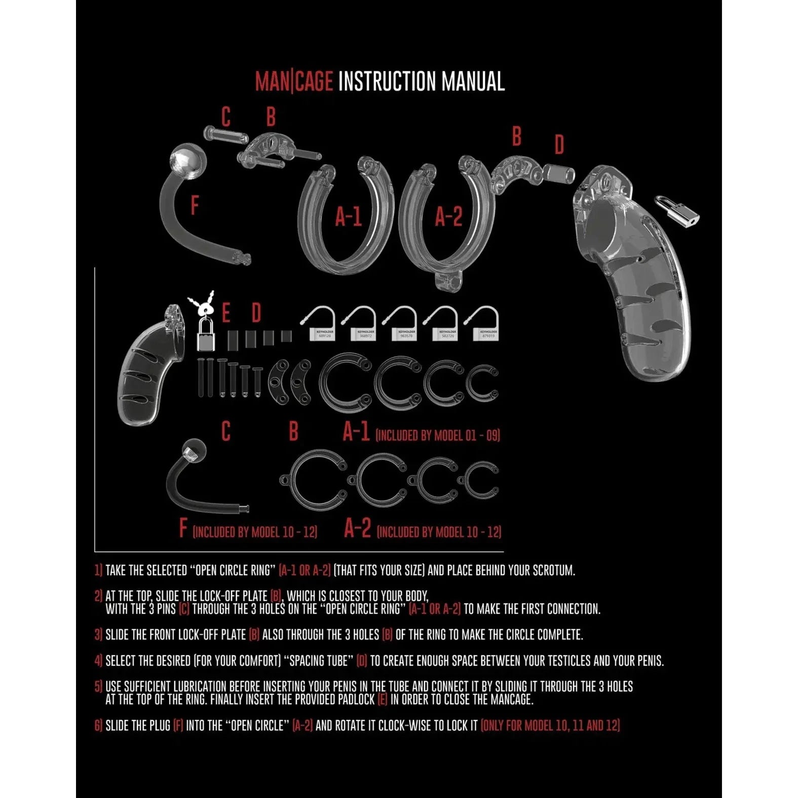 This chastity cage is manufactured from high-grade polycarbonate, a very light, durable and hypoallergenic material. The cage consists of three parts which fit perfectly together. The two guidance pins connect the top parts and the oval taper pin connects the rings with the cage. A variety of rings in different sizes and distance pieces will allow you to create the perfect size!