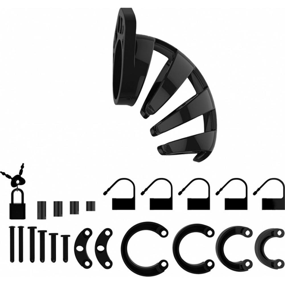 Hygiene is important while wearing a cage, so the Man Cage is equipped with a variety of vents and a urination opening. Kit includes cage, four different sized base rings, connector pin unit, connector pins, spacers, a metal padlock, and 5 plastic tie-wrap locks.