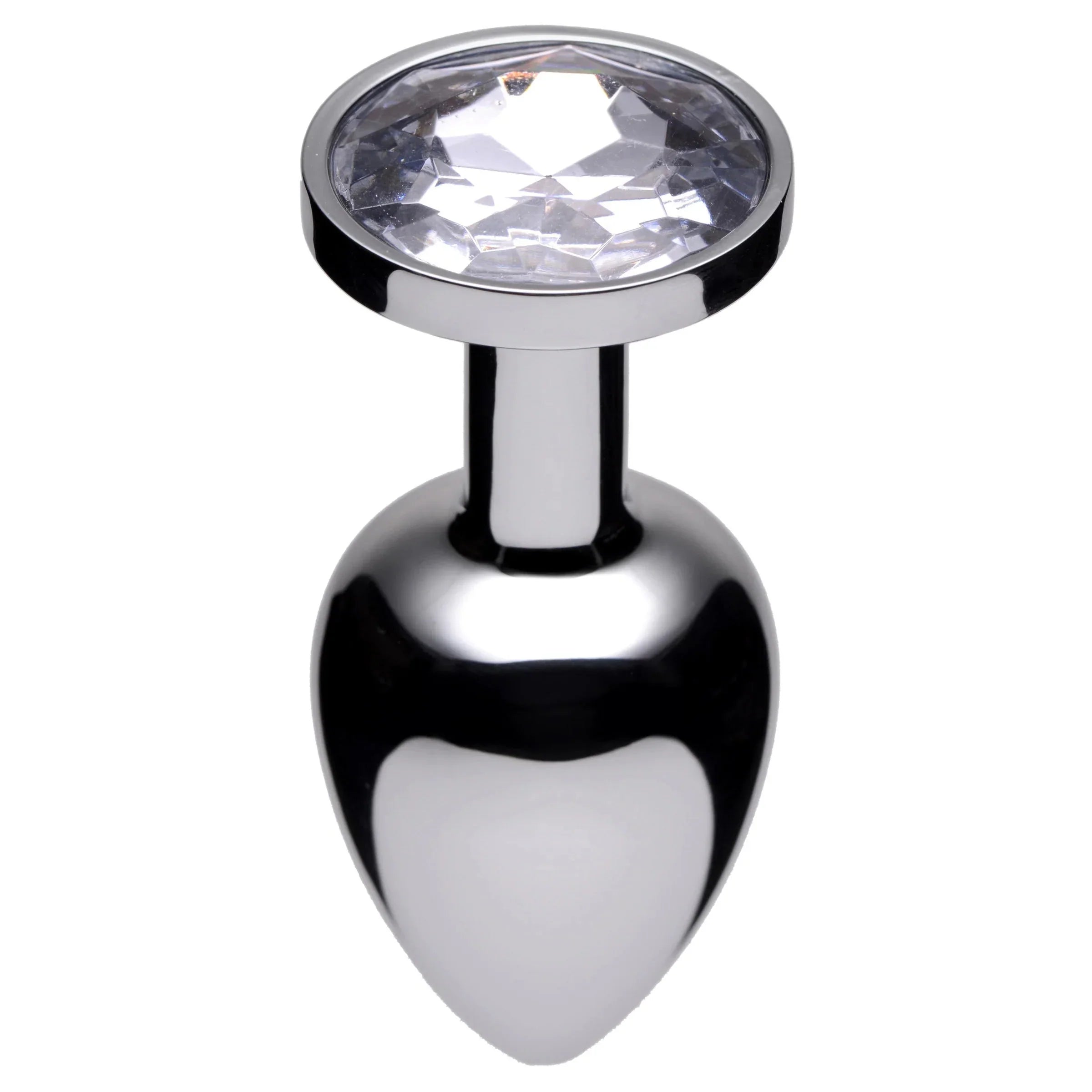 This sparkling jewel accented metal butt plug is ready to take your anal play to new, exciting levels with a classic, stunning design and smooth curves that fit just right! A smooth, spade shape with a tapered tip and sturdy stem slips into your backdoor, while a round base keeps your sex safe by keeping the novelty from slipping too far in.