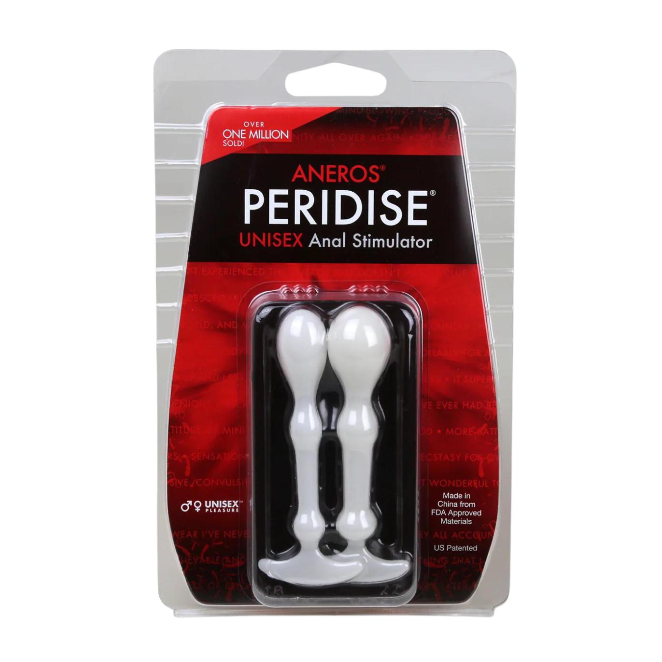 The Peridise by Aneros is an anal stimulator that has an ergonomic design created to provide good anal stimulation for beginners. The toy's shape reflects the body's natural response to resist insertion, and the two knobby sections on the toy heighten the push/pull response. The box contains a pair of stimulators of approximately the same shape, only different sizes.