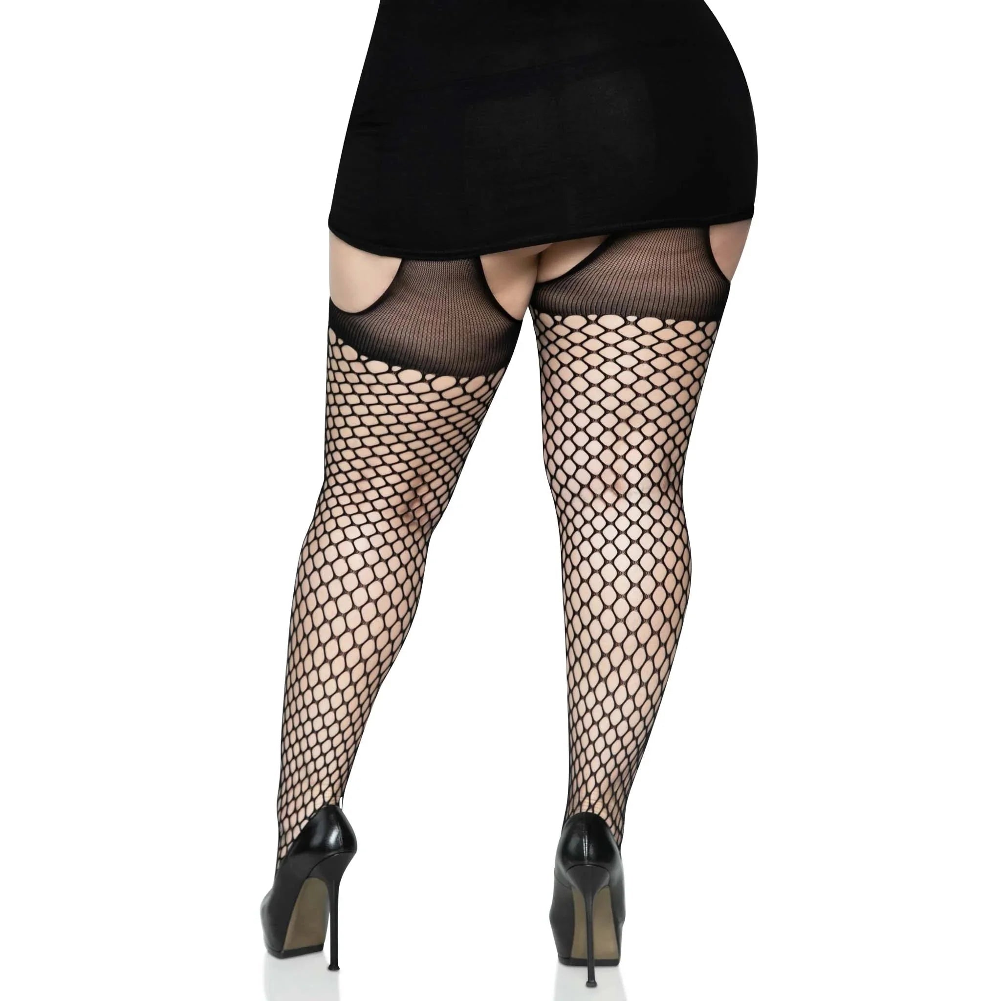 Dare to go bold in the plus size Addison oval net suspender hose by Leg Avenue. These curve-hugging stockings combine the sexiest details of crotchless lingerie with the classic looks of fishnet tights for a look that's simply stunning. Edgy oval net with a comfort-stretch opaque top make these the perfect plus size tights for day or night looks.