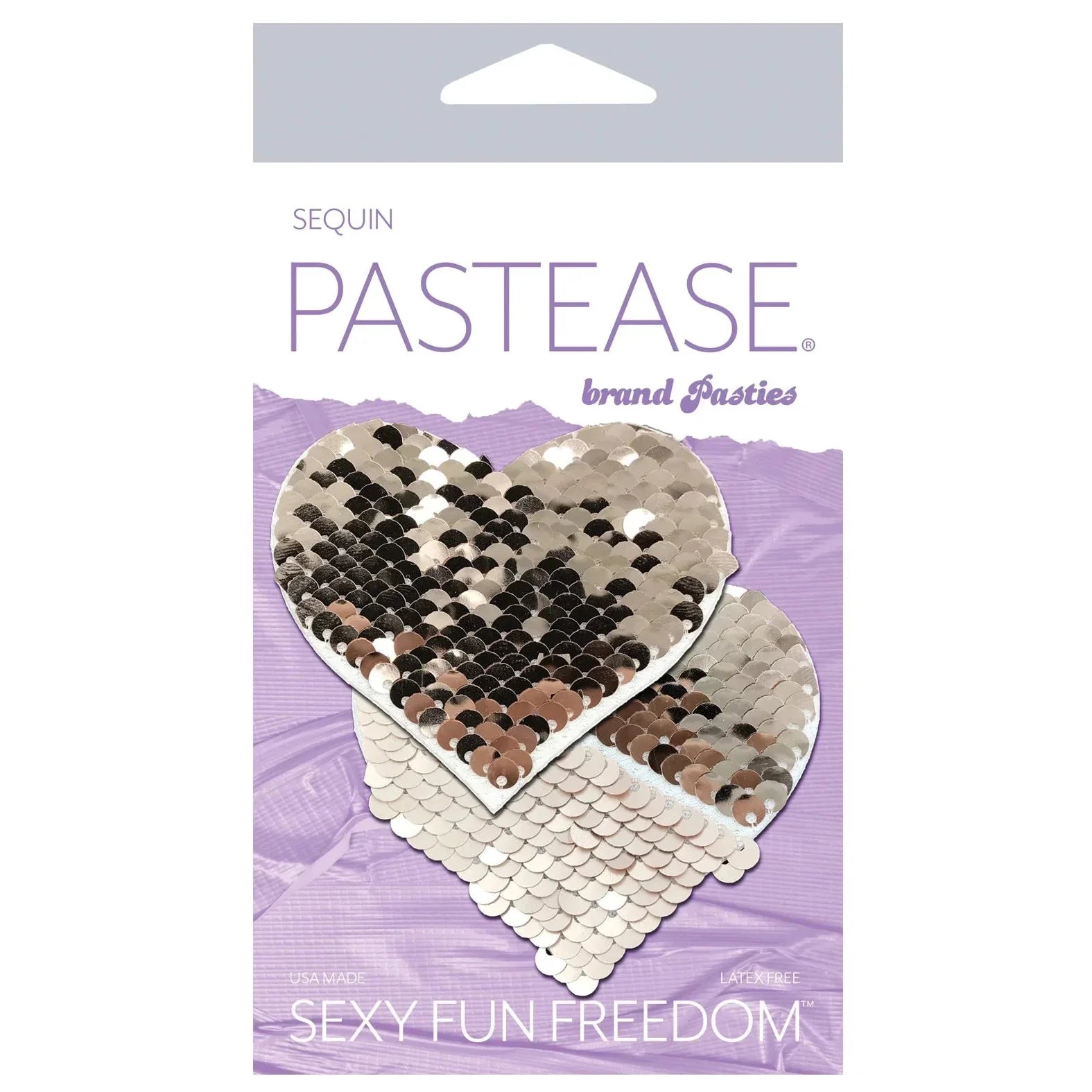 Pearl & White Color Changing Sequin Heart Nipple Pasties by Pastease(R) are hand-made in the USA of reversible sequin material that forms to curves and resists wrinkling over hardening nipples. Just peel-and-stick on clean, dry skin! All Pastease(R) pasties feature latex-free, medical-grade, waterproof adhesive that stays securely in place for as long as you like and until they are gently removed. Conceal or Reveal with Pastease(R) nipple pasties when worn with a sexy outfit, daring bikini, sheer top, revealing dress, Hefty bag, body lotion, crazy costume, party theme or nothing at all! Dimensions: 3 inches wide x 2.5 inches tall Coverage: 1.8 inches