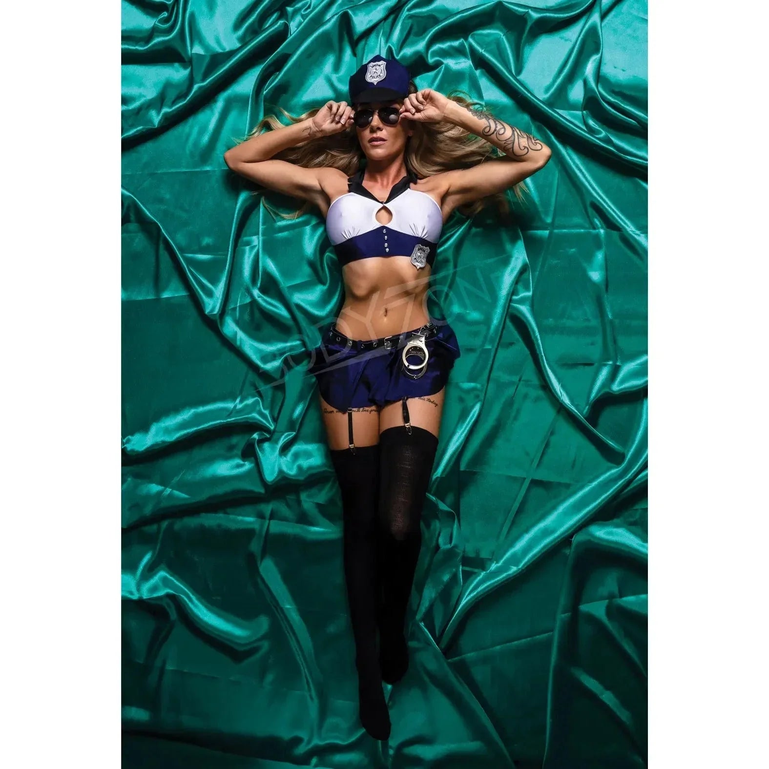Role Play Cocky Cop by Body Zone Apparel. 8 piece Cocky Cop set: 1 top, 1 thong, 1 belt skirt with garters, 1 hat headband, 1 pair of thigh highs, 1 set of hand-cuffs.