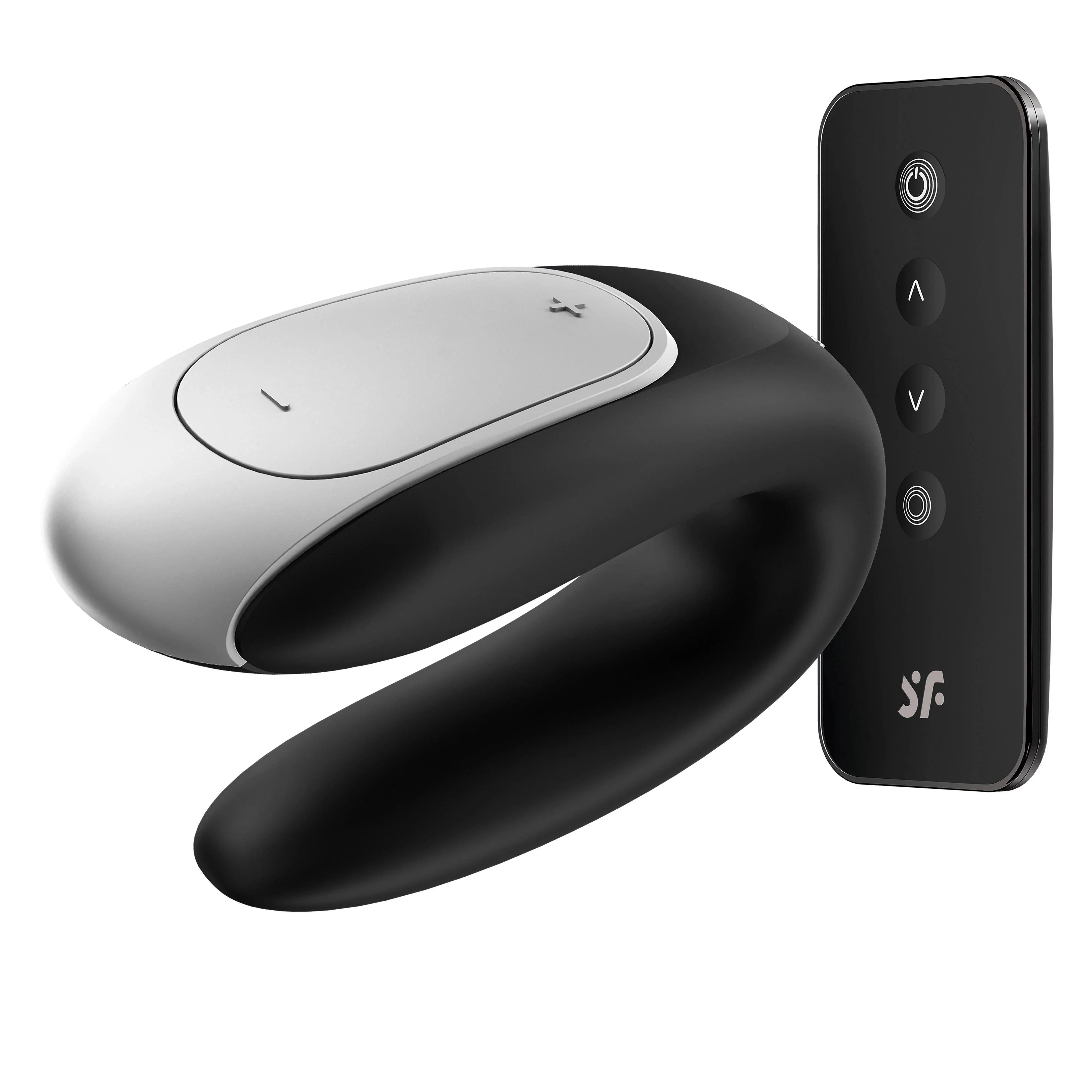 Features: 2 super strong power motors. With wireless remote control for partner use. Body friendly phthalate free materials Silicone. Waterproof IPX7. Can also be used without the app. Preset programmes can be edited. What can the Satisfyer Double Fun couples vibrator do? The Satisfyer Double Fun will enrich your love life with powerful vibrations that stimulate both of you sensually. The classic U-shape couples vibrator is worn during lovemaking and stimulates the entire penis as well as the G-spot with its insertable shaft. The second motor is hidden at the other end of the couples vibrator and stimulates the clitoris at the same time. The couples vibrator is made of body friendly silicone, which feels especially soft on the skin. Your fun together can also continue in the shower or bathtub: Thanks to its waterproof IPX7 finish, the Satisfyer Double Fun is the ideal companion for wet and wild pleasure. If your device ever runs out of steam, you can recharge the integrated batteries with the included USB charging cable.