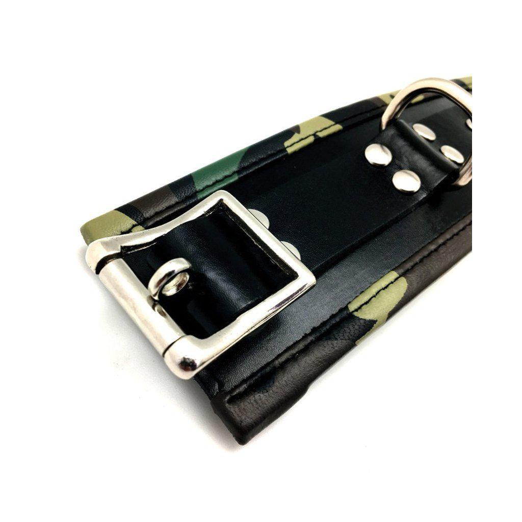Leather Wrist Cuffs with Piping and padding camo, with Duo carabiner. Possibility to close with Padlock High quality leather. Leather thickness: 4mm, for Hard games!