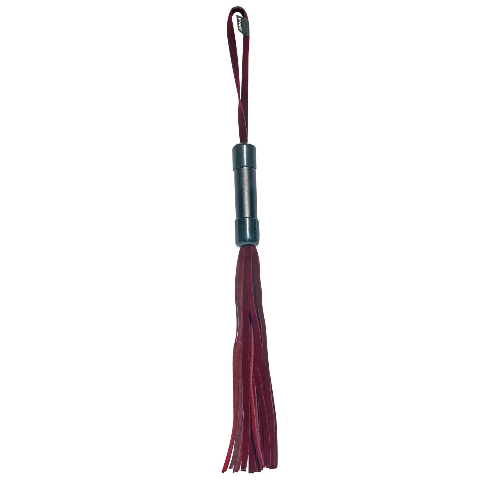 Crimson velveteen tails cascade delicately onto your lovers tepid flesh, gradually bringing their senses to the surface. Lulled yet titillated, their breath bated and eyes obscured beneath a silken blindfold, you feel their nervous anticipation silently begging for more. A moment of silence ensues, followed by a satisfying swish as falls fly fiendishly onto flushed flesh. An irresistible moan of surprise escapes their lips and a full body twitch lets you know they're ready for another lash. The sturdy handle and wrist loop give you a dependable grip for intense encounters.