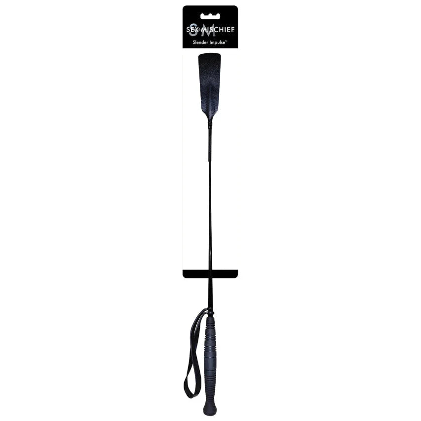 This sleek, snappy crop will feel at home in your hand as it stings your plaything's flesh! A comfortable leather grip gives you command of your steed and a firmness to be reckoned with when whipping them into shape. Slim and agile styling perfect the art of the crop and entice their skin with sharp pangs of pleasure. A wrist loop adds security to your unwavering control. When you brandish this willowy wind-cutter, there is no question of who wields the power.