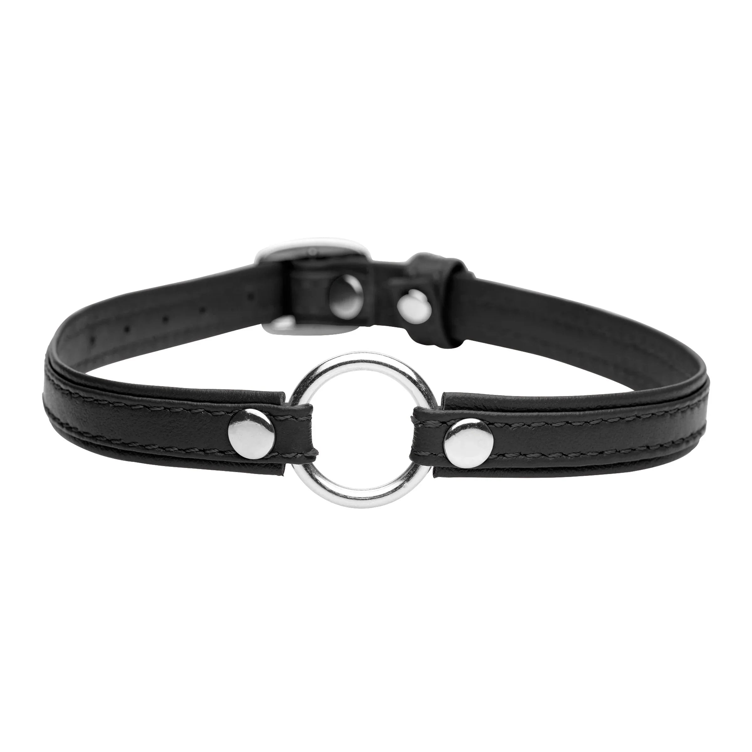 The nickel-free metal O-ring shines bright and accomodates leashes, chains, and collars for an extra kinky appearance.
