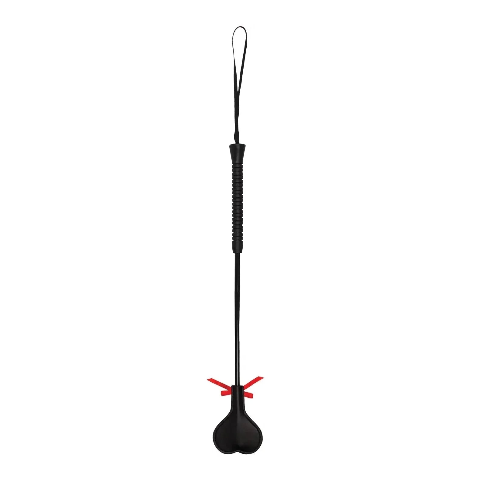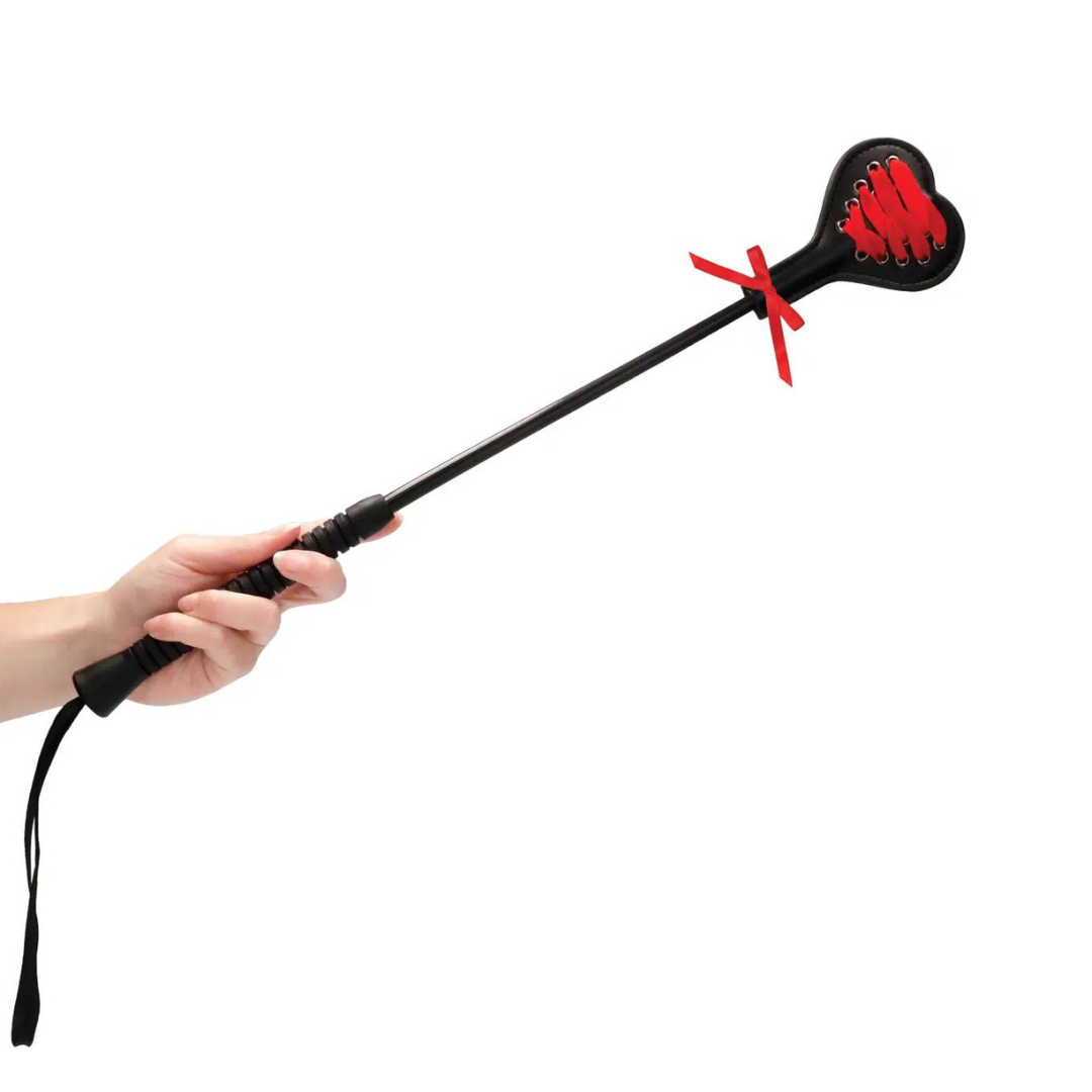 Nice and firm in hand, this ultra sturdy tool spanks, slaps and (playfully) stings with precision. Red ribbon crisscrosses up one side of the heart shaped tip, while the opposite side is nice and smooth. The lacing will cushion the playful blow just a little - use the smooth side for a bit more bite. A nice long wrist cord keeps the Crop close at all times.