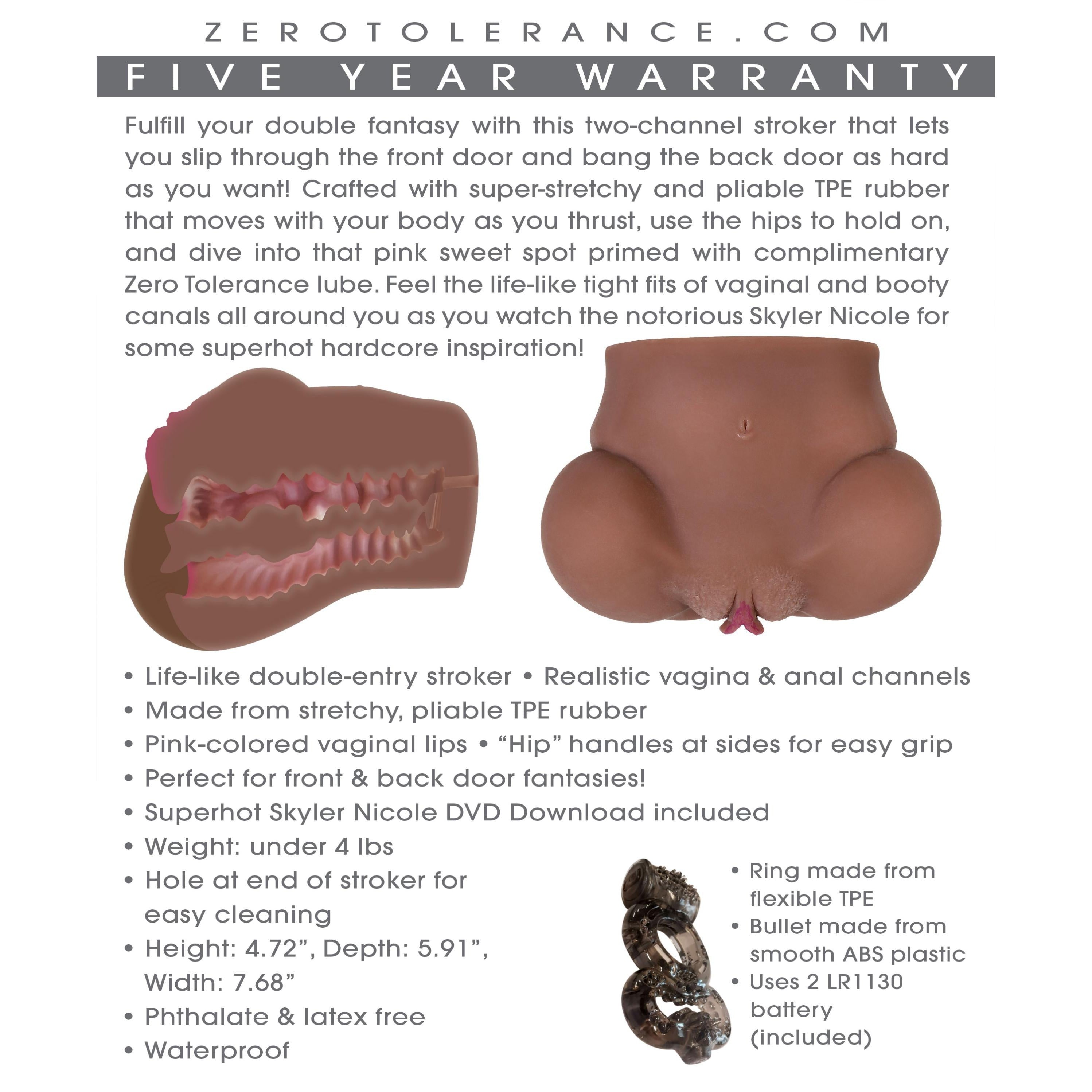 Fulfill your double fantasy with this two-channel stroker that lets you slip through the front door and bang the back door as hard as you want! Crafted with super-stretchy and pliable TPE rubber that moves with your body as you thrust, use the hips to hold on, and dive into that pink sweet spot primed with complimentary ZT lube. Feel the life-like tight fits of vaginal and booty canals all around you as you watch the notorious Dani Daniels for some superhot hardcore inspiration!