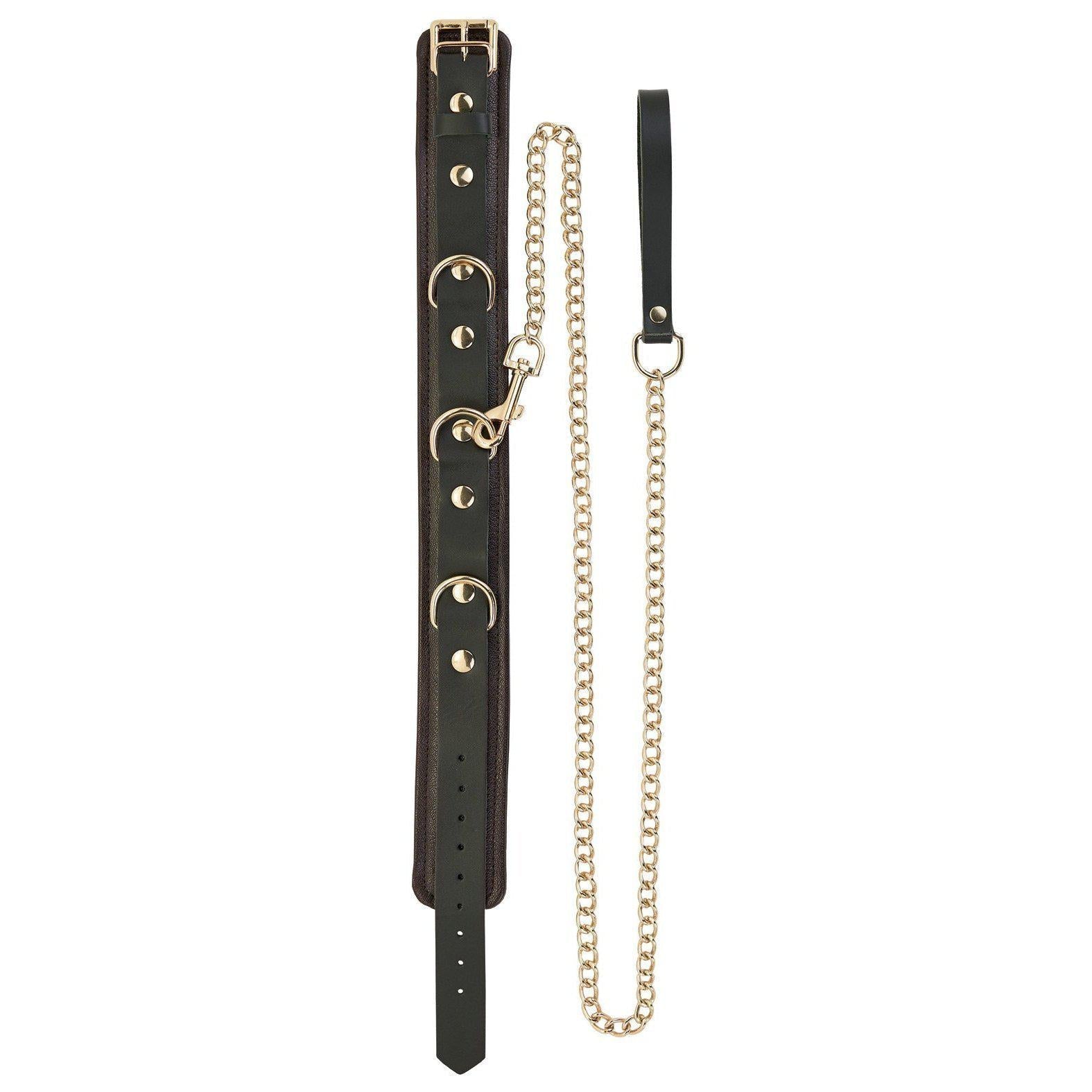 - Fully adjustable collar made with full-grain leather and features a 3' long metal chain