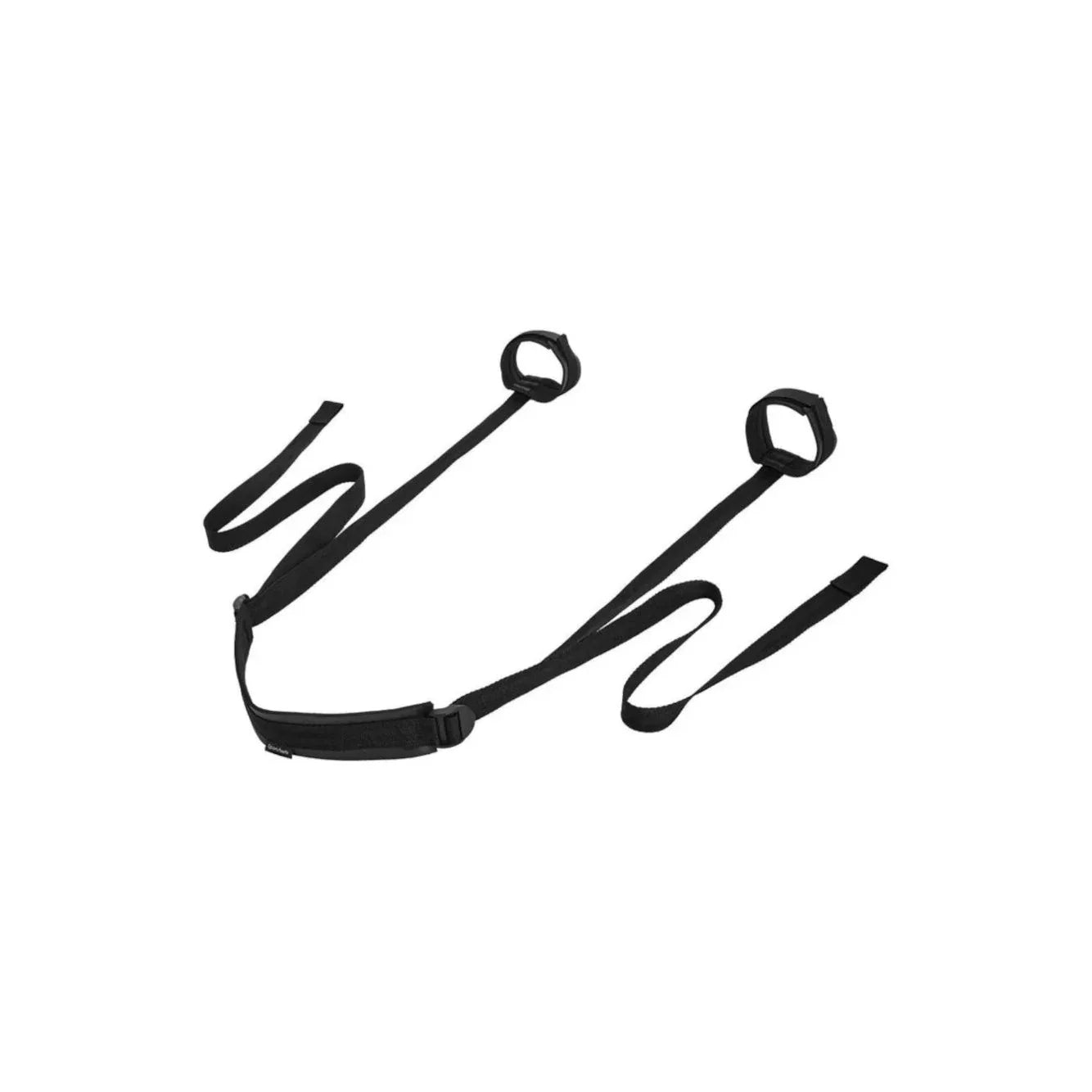 The Sportsheets Sex Sling is a portable, adjustable sex sling that you can use in various positions. The sling is made from quality neoprene and polypropylene webbing attached with plastic hardware. A section goes on the back of the neck, and Velcro cuffs loop around the feet while you hold the two other straps with your hands. This way, you control the tension while the sling keeps your legs in the air comfortably.
