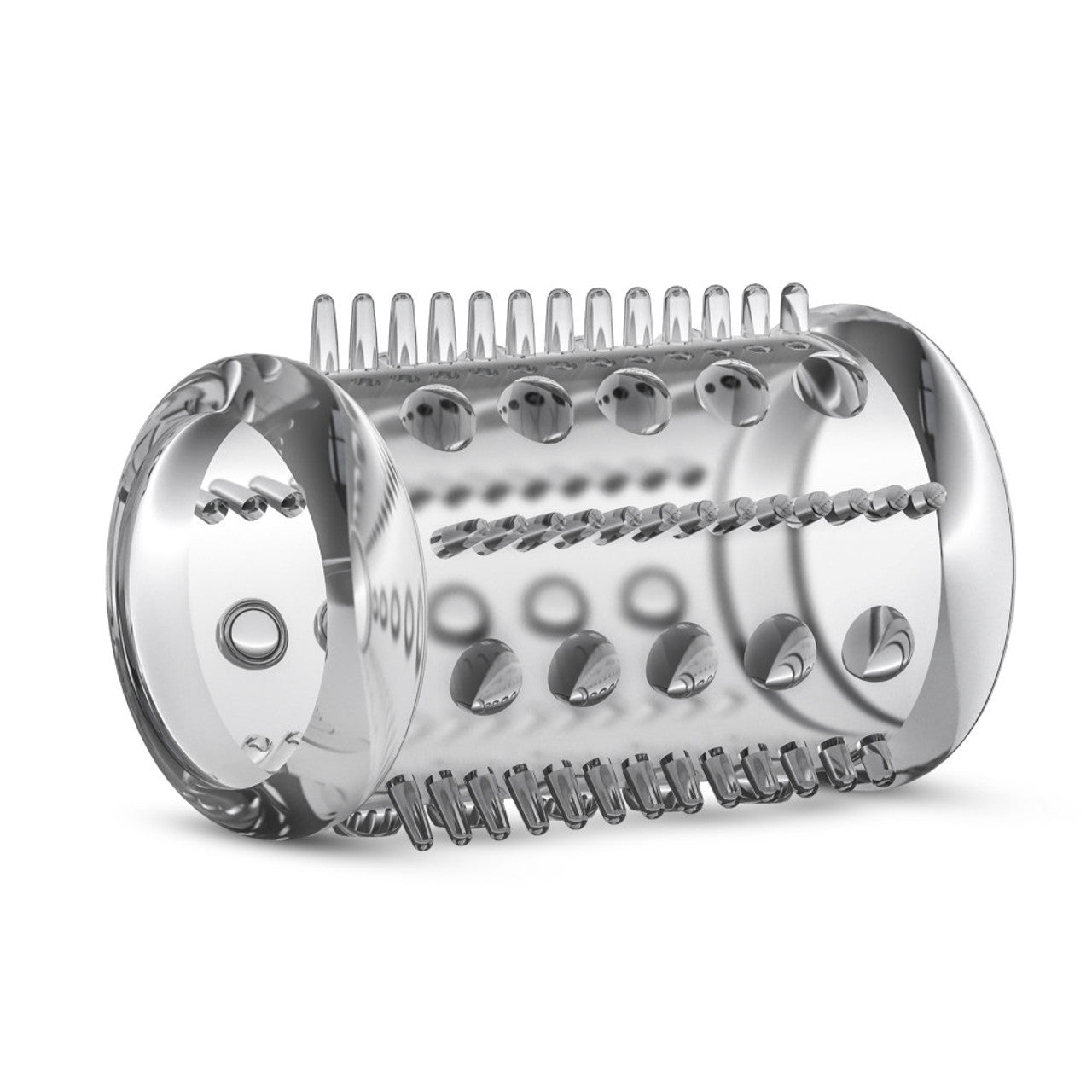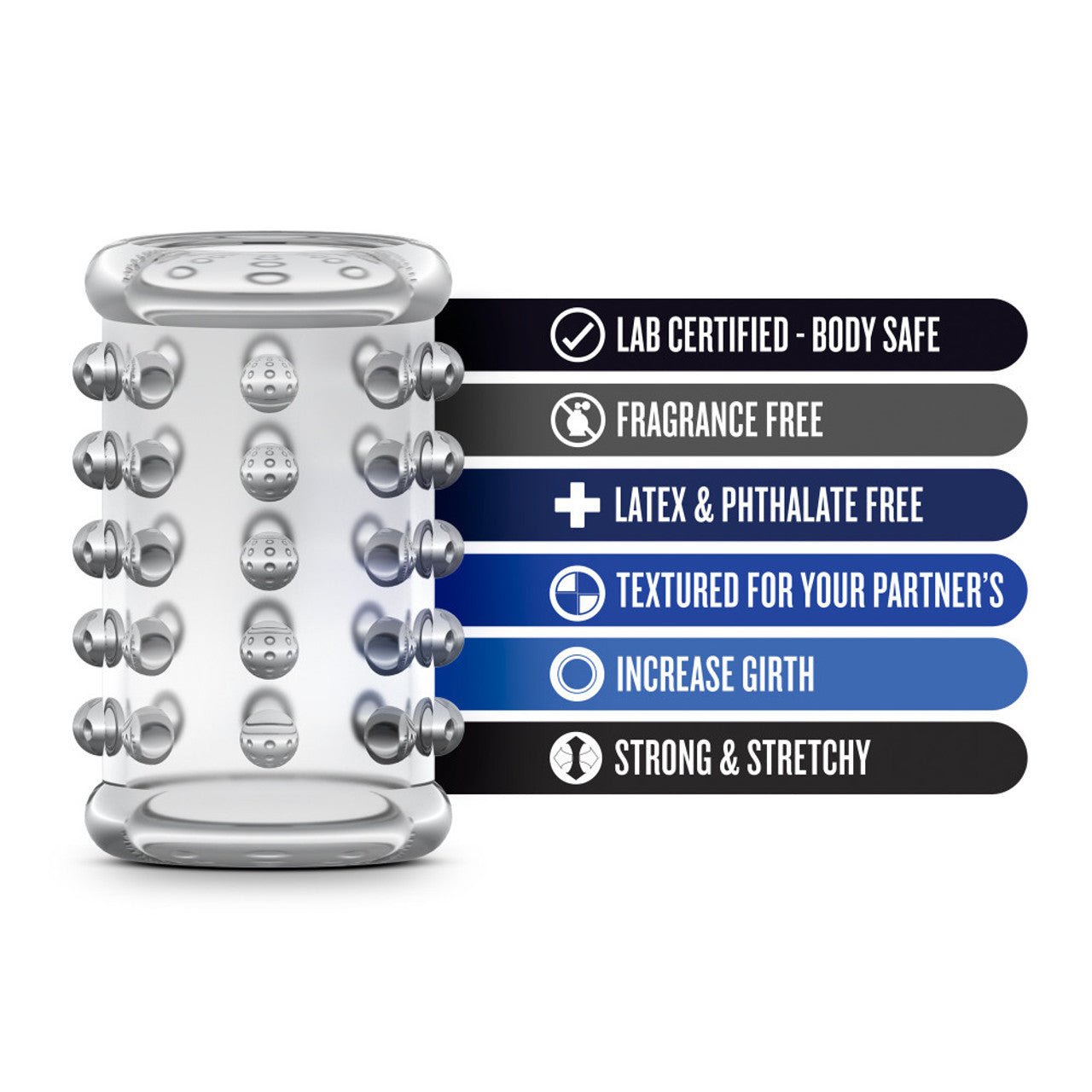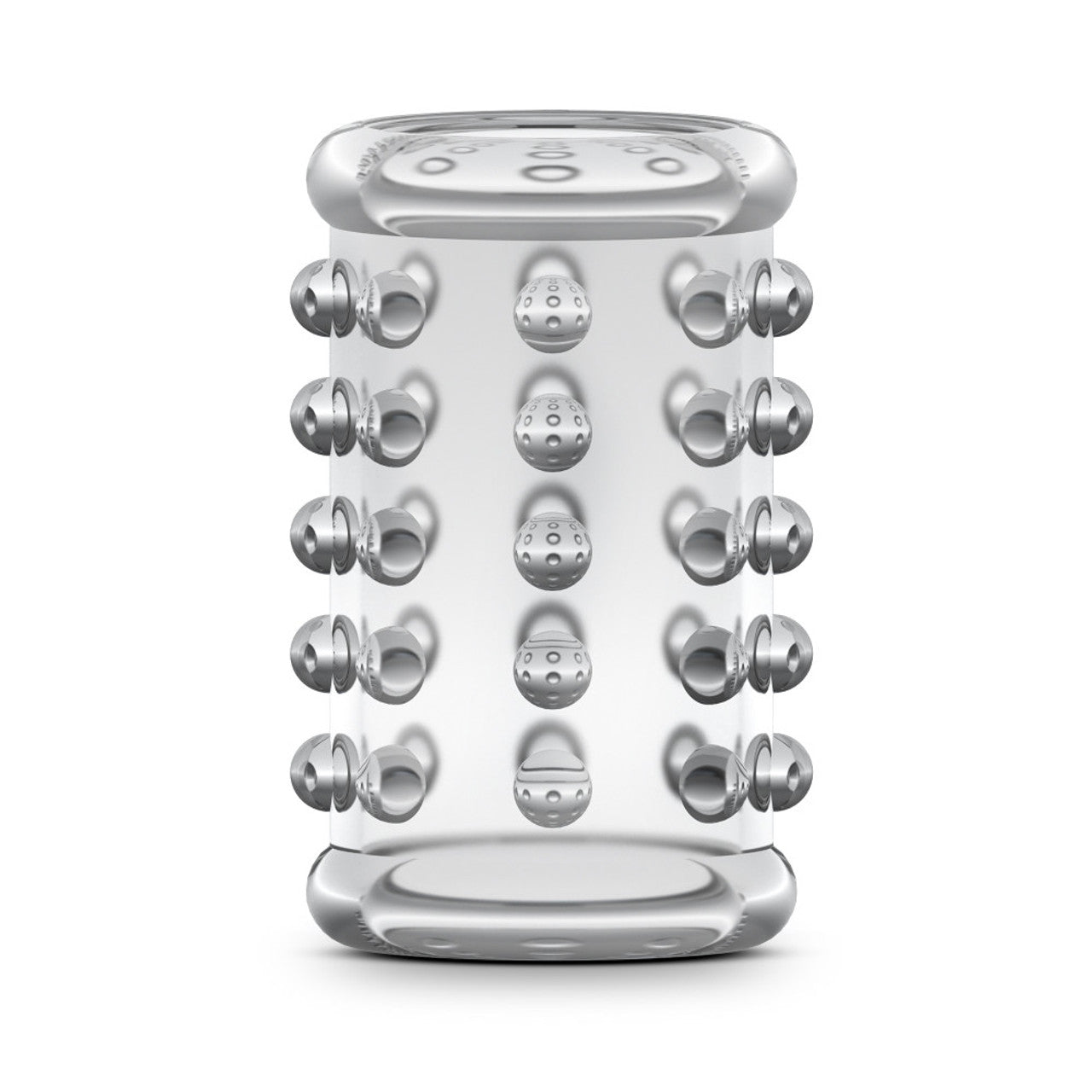 Studded and ribbed, yet flexibly soft enough to adapt to your love play. The myriad of projections from this cock sleeve are potent enough for the most delicate of sensations; for anything you could want to put it through. The sleeve itself adds physical girth to you or your partner's member or toy, and the studded, flexible projections are designed for only maximum stimulation and excitement.