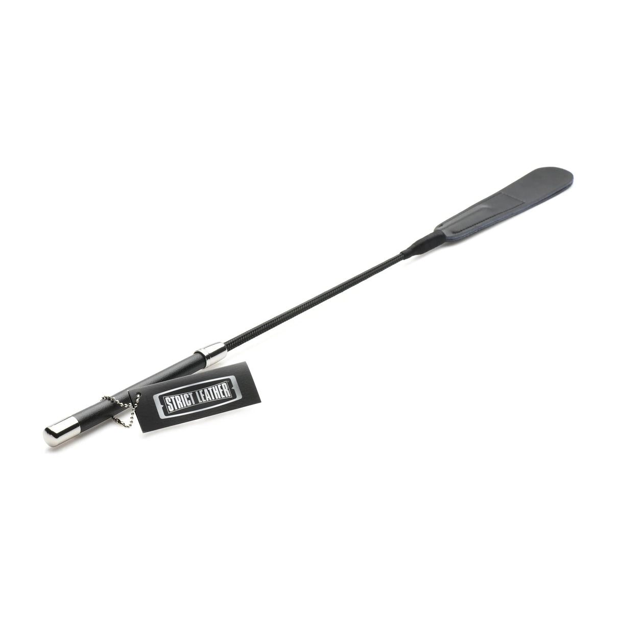 This premium leather riding crop is a fantastic impact tool. The handle is wrapped in a layer of leather with a metal tip. The shaft is rigid, but has a little flex, so on impact the split leather tip provides a nice bite.