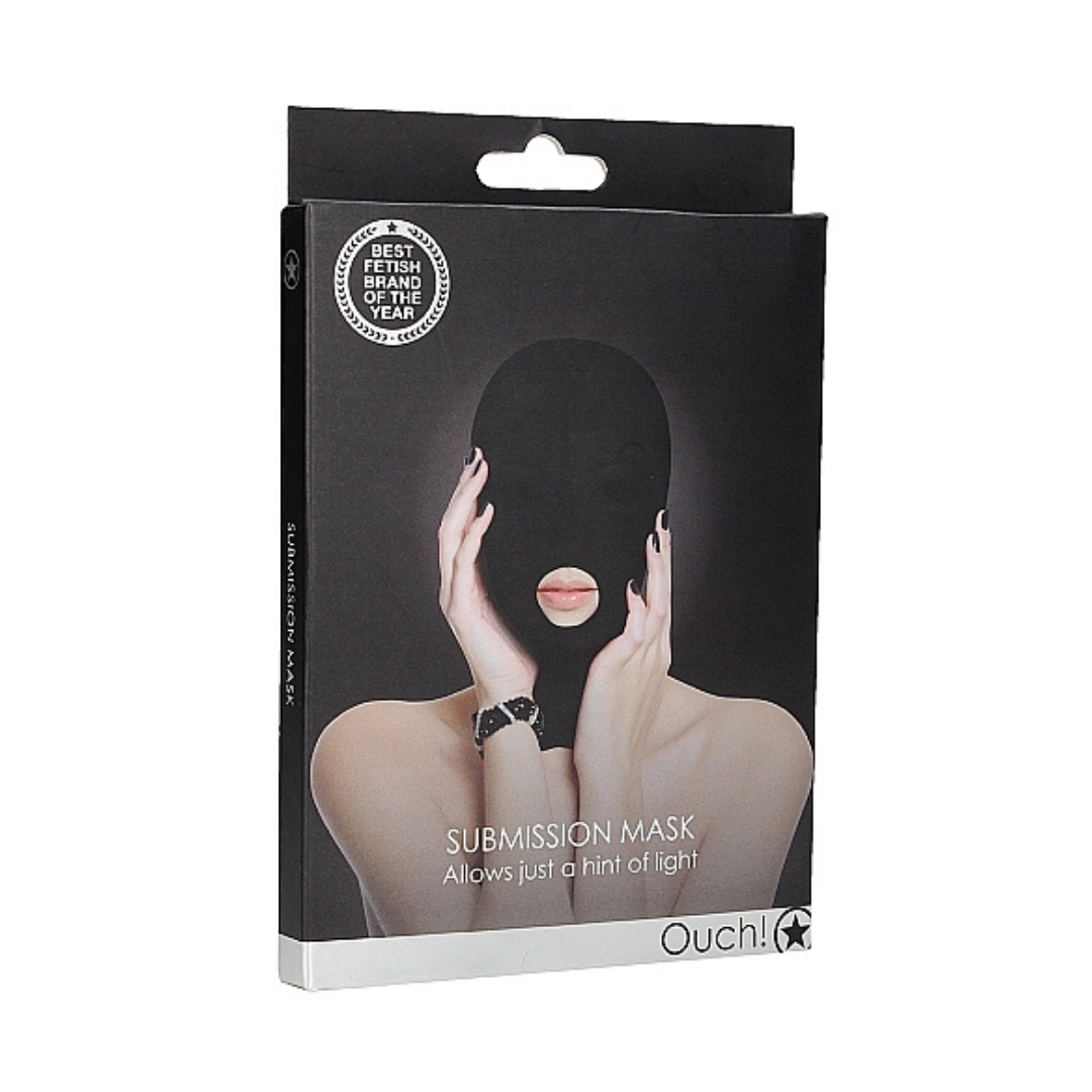 This comfortable Submission mask is designed to stretch completely over the head. The fabric allows just a hint of light in while impairing vision and awakening other senses. The shiny hood can be worn by him or her, and the thin lightweight fabric makes breathing and hearing a snap. Best of all, you still have access to your subject's mouth!