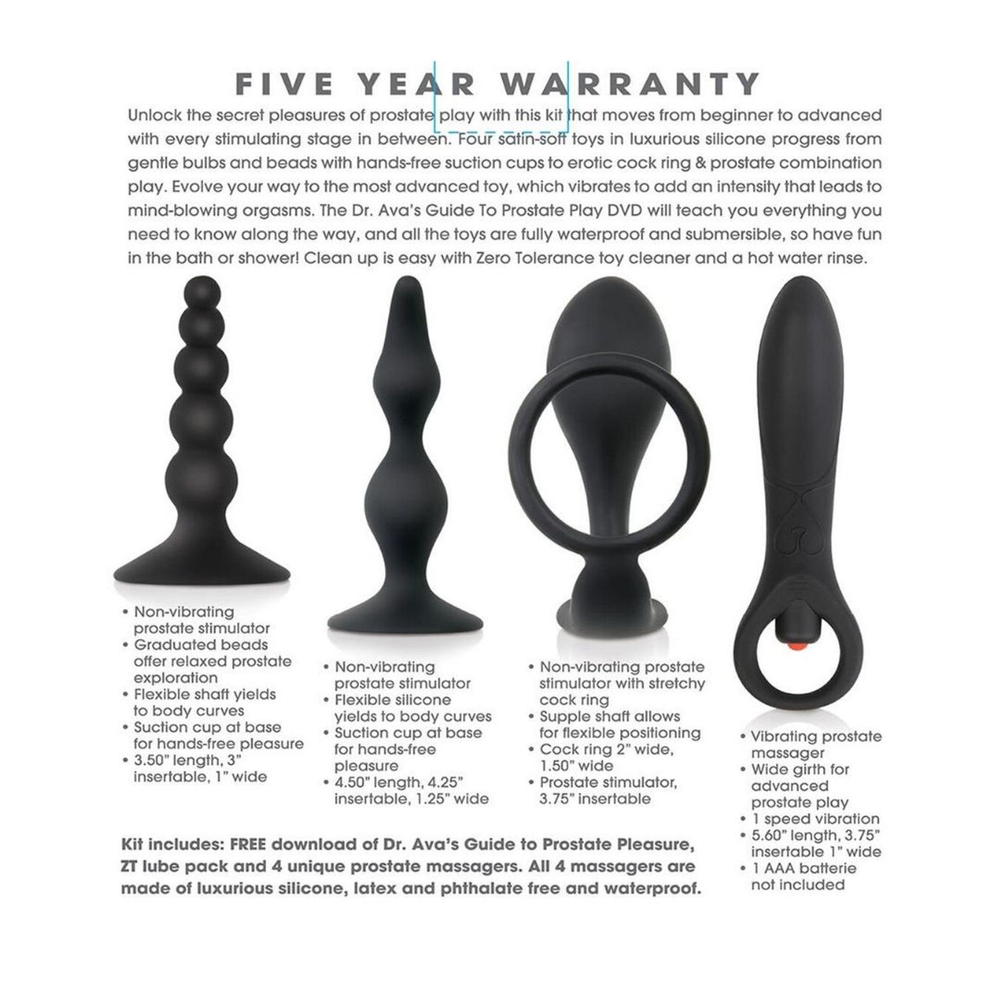 Kit includes: Free download of Dr. Ava's Guide to Prostate Pleasure, ZT lube pack and 4 unique prostate massagers. All 4 massagers are made of luxurious silicone, latex and phthalate free and waterproof.