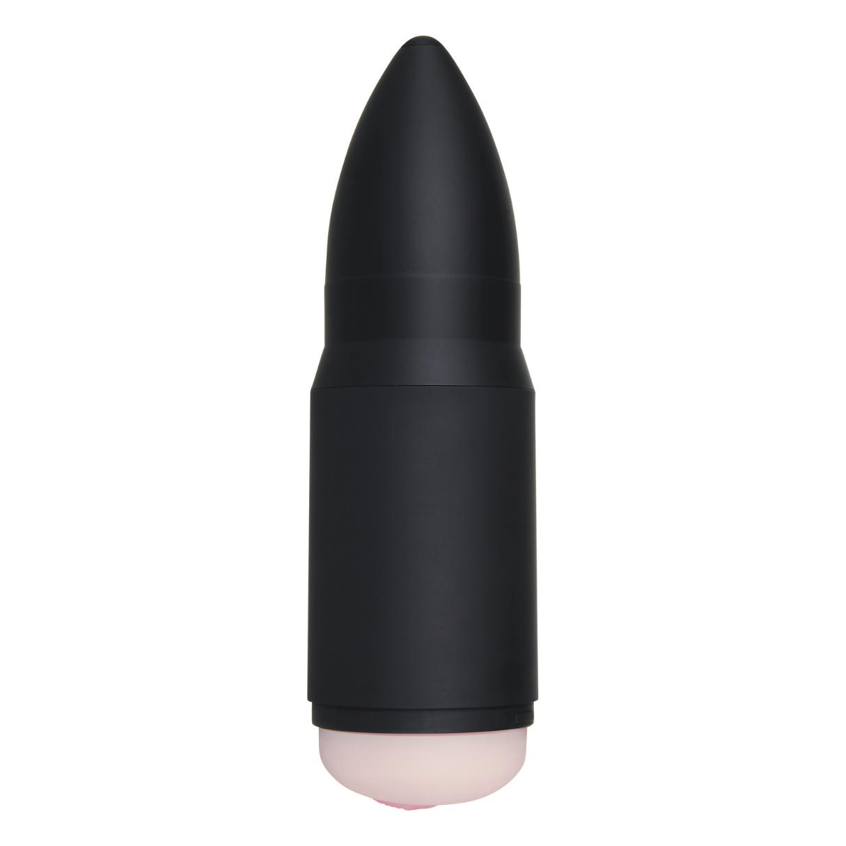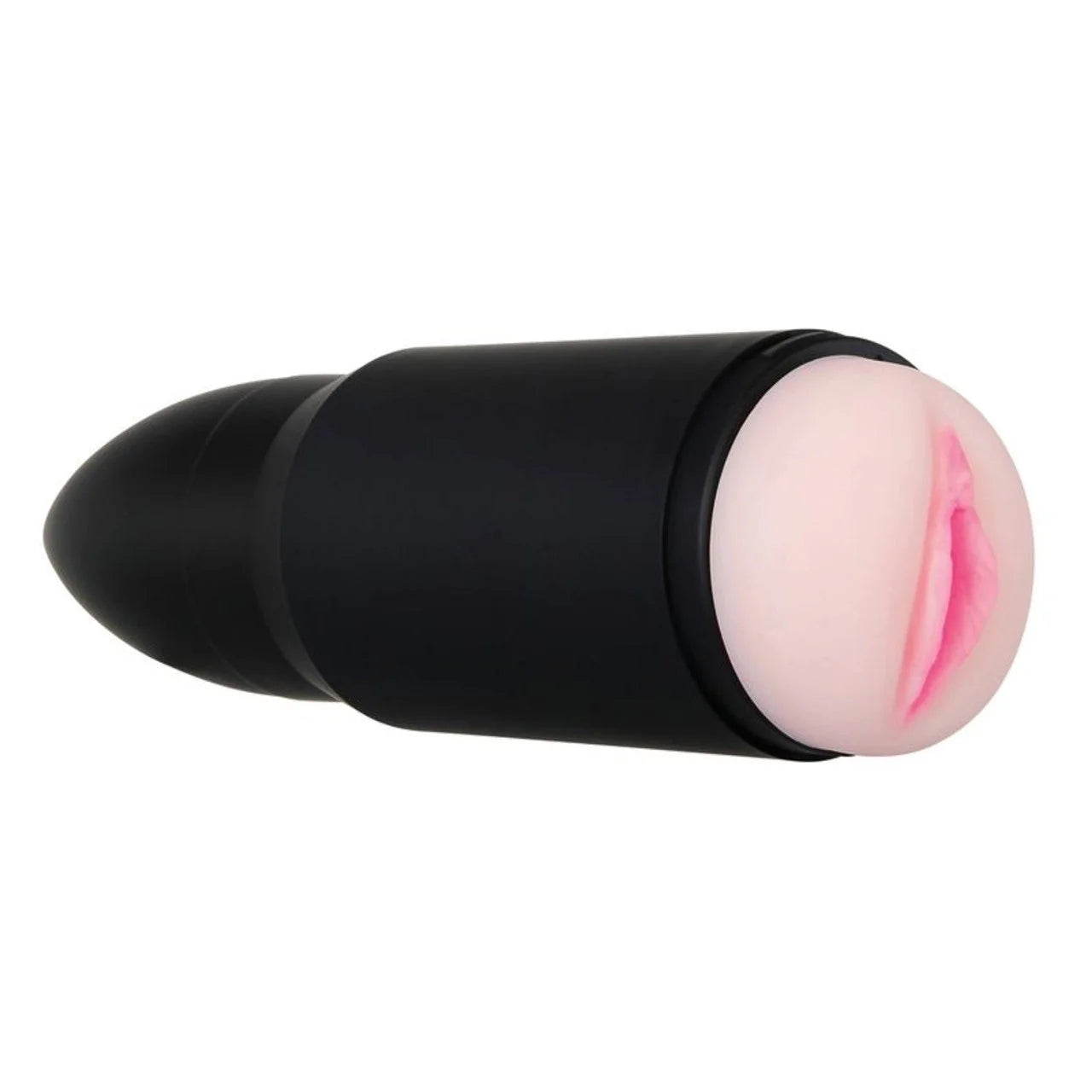 The Zero Tolerance Shell Shock Vibrating Stroker looks like an oversized bullet casing that makes it easy and discreet to store and carry with you. The bottom of the ABS bullet-shaped case opens up to reveal the opening in the shape of realistic pink pussy lips.
